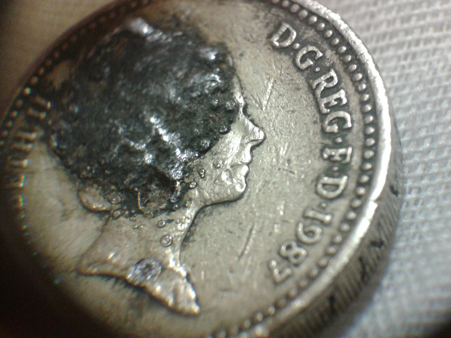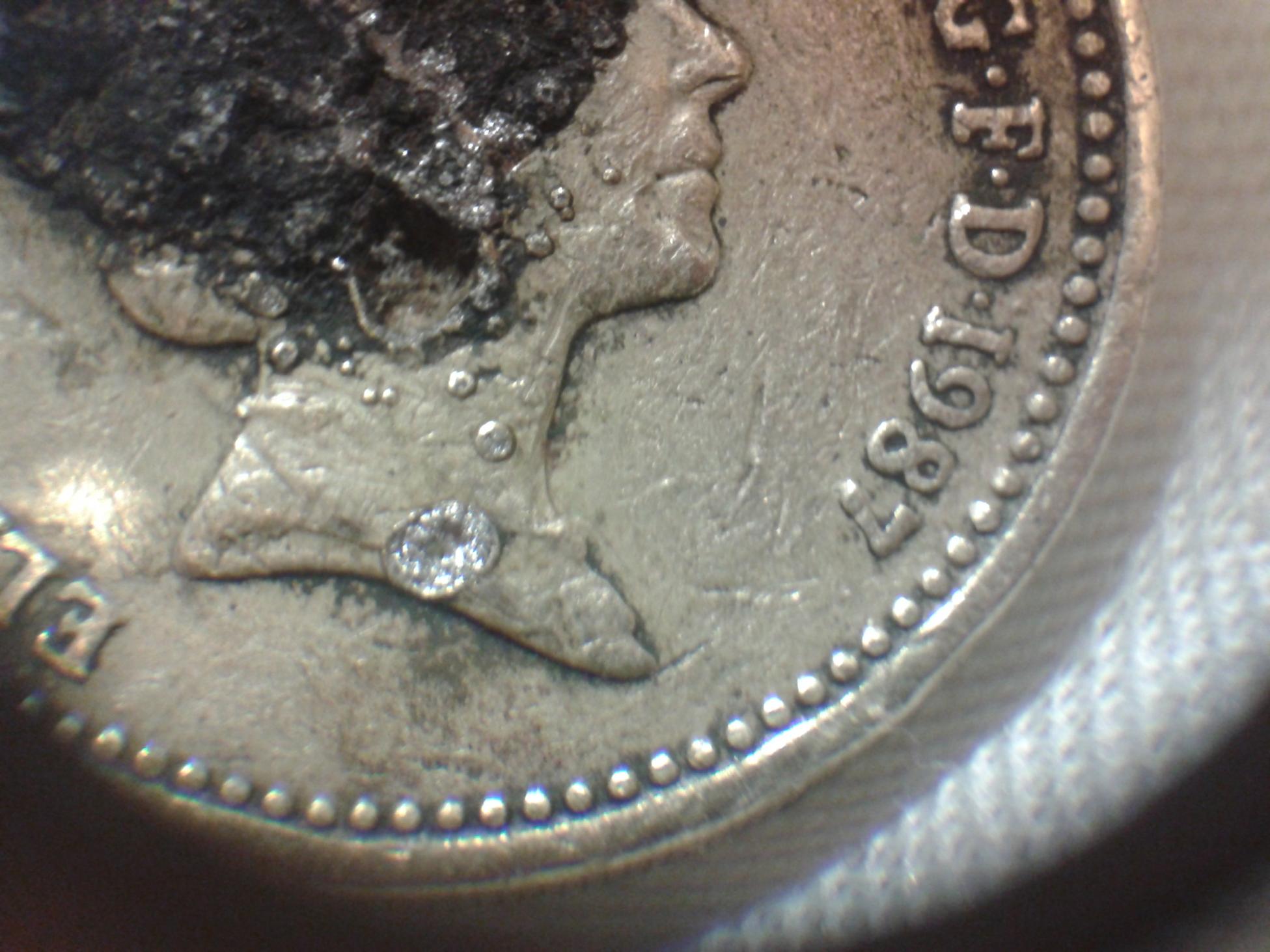 This coin has some cuds on the neck and face of the queen. But what is the the gray metal? Is it steel from the die? I don,t think its been welded or some PMD.