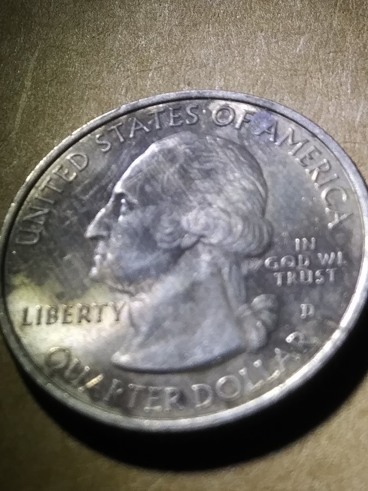 I agree with environmental discoloration. Were it missing clad, weight would be less than normal. Quarter weight missing one clad layer = 4.71 g +/- 0.347 g; missing two clad layers = 3.75 g +/- .467 g.