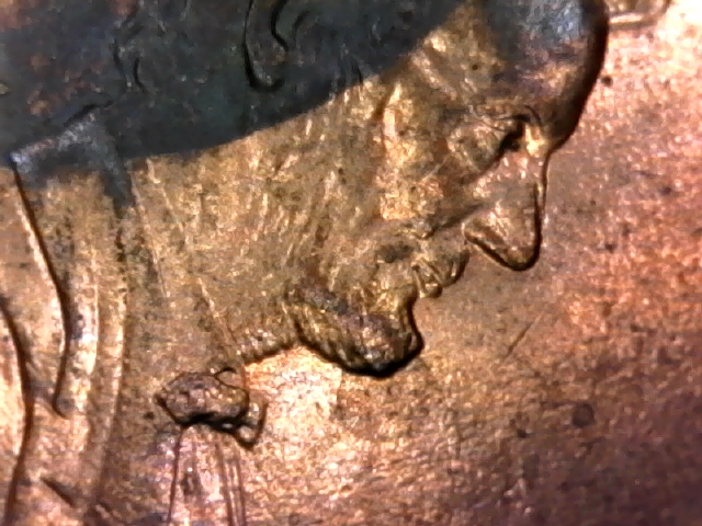 What do you guys think? 1st one has melted copper on it i think 2nd and 3rd pics are same penny. has like 2 noses or something. could just be damage Last one looks like Copied 8 or something. Not really damage but see what you guys think