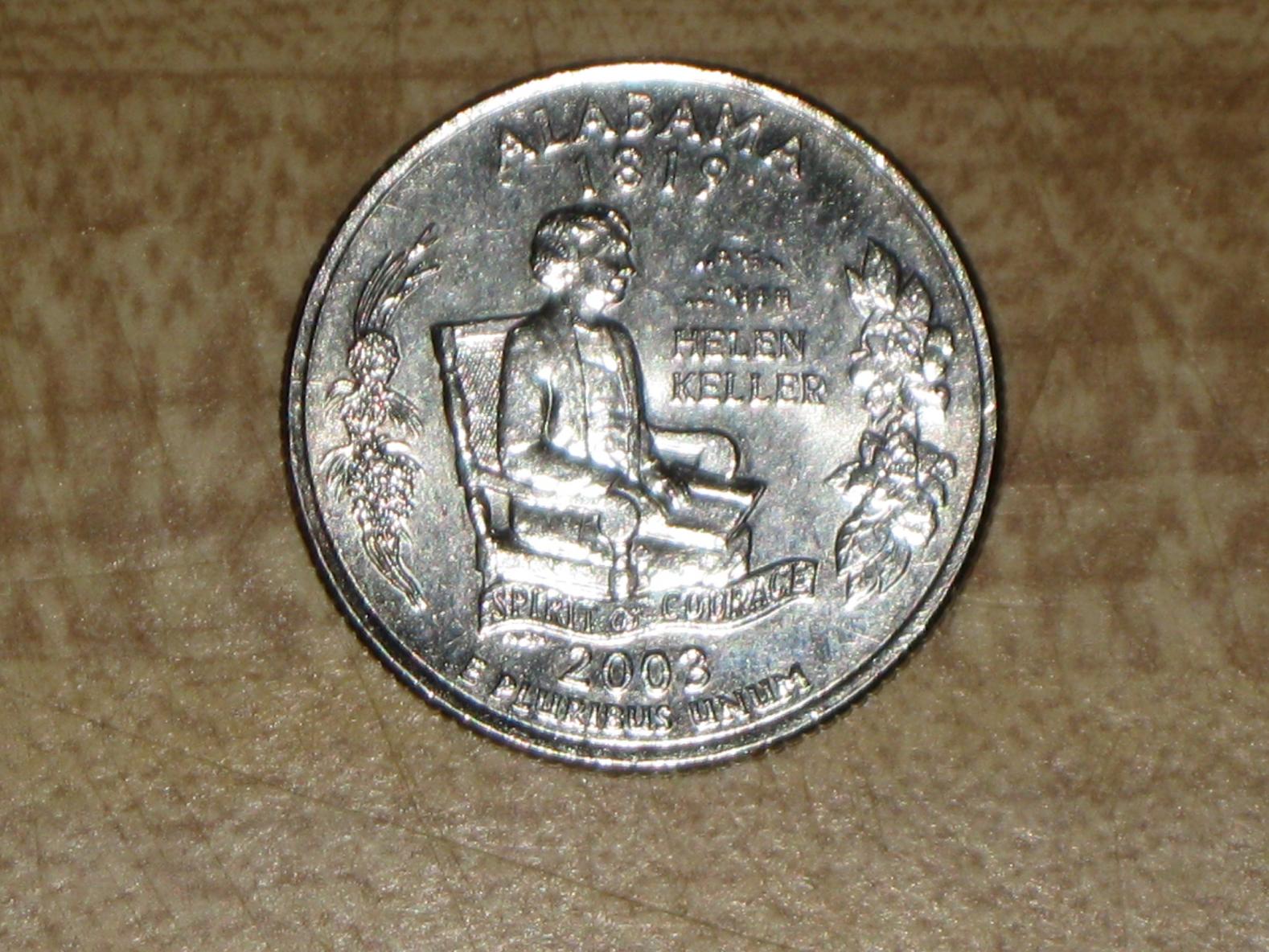 First post, so bear with me please. Yesterday in change I received a 2003D Alabama state quarter. The coin has no visible copper in the rim. Vending machines won't take it (it jams like it's too light.) And it doesn't "sound" right. Like how silver has that unique "sound" and later quarters have a certain sound. It has neither. Is this an error? (Hope the pictures are clear enough, not exactly a great photographer.)