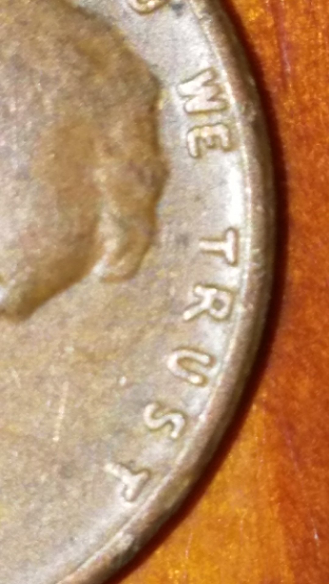 The "t" at the end of trust looks to be further away in the first picture. And the other words look like doubled die. The reverse is completely normal.
