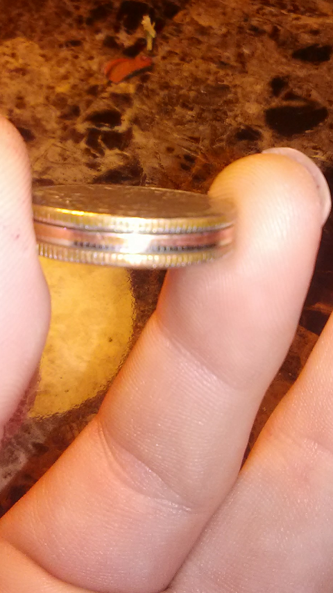 OK, lets look at the edge, which by the way, I see copper in the middle, but I see 2 silver colored layer, one each side of the copper. It does not look smooth to me, I see marks, but also what I see is that the edge is too flat. Only with proof coins do you see right angle edges as seen there,,and it is not a proof coin. Copper color can be from chemical reaction ( toning ) and not unusual, but again none of this occurs in the minting process so that is why most say it is damaged. People who are answering you are trying their best to help, so respect to their answers should be shown. Some who ask just want reaffirmation of their hopes, so we ask similar respect also. Thanks Jim