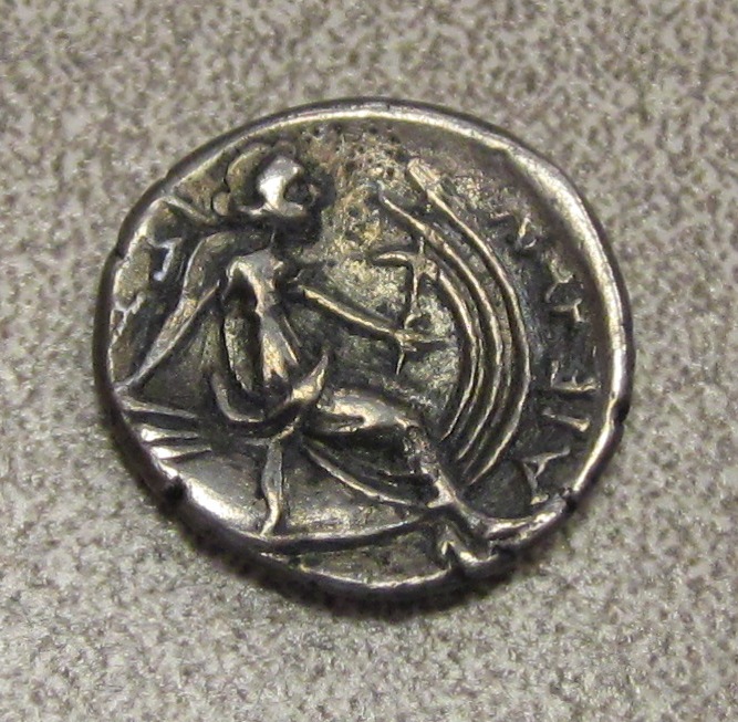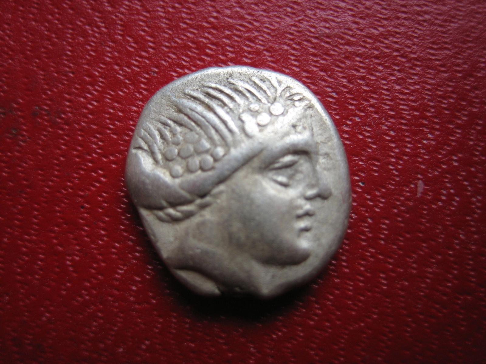 Doug had told me these are heavily faked. Took a dealer who specializes in these to confirm/convince him mine was real, lol. Histiaia, Euboia 340 - 330 B.C. Silver Tetrobol O: Head of nymph Histiaia right wearing an earring, hair bound in sakkos (sphendone) wreathed with vine R: Nymph seated upon a stern of galley holding a mast with cross-piece (trophy stand), grapes on vine to left; wing on prow; IΣTIAI-EΩN 14mm 2.4g BMC Central Greece p.127, 24-25; Sear 2495 Slightly overstruck. Die break on nose.