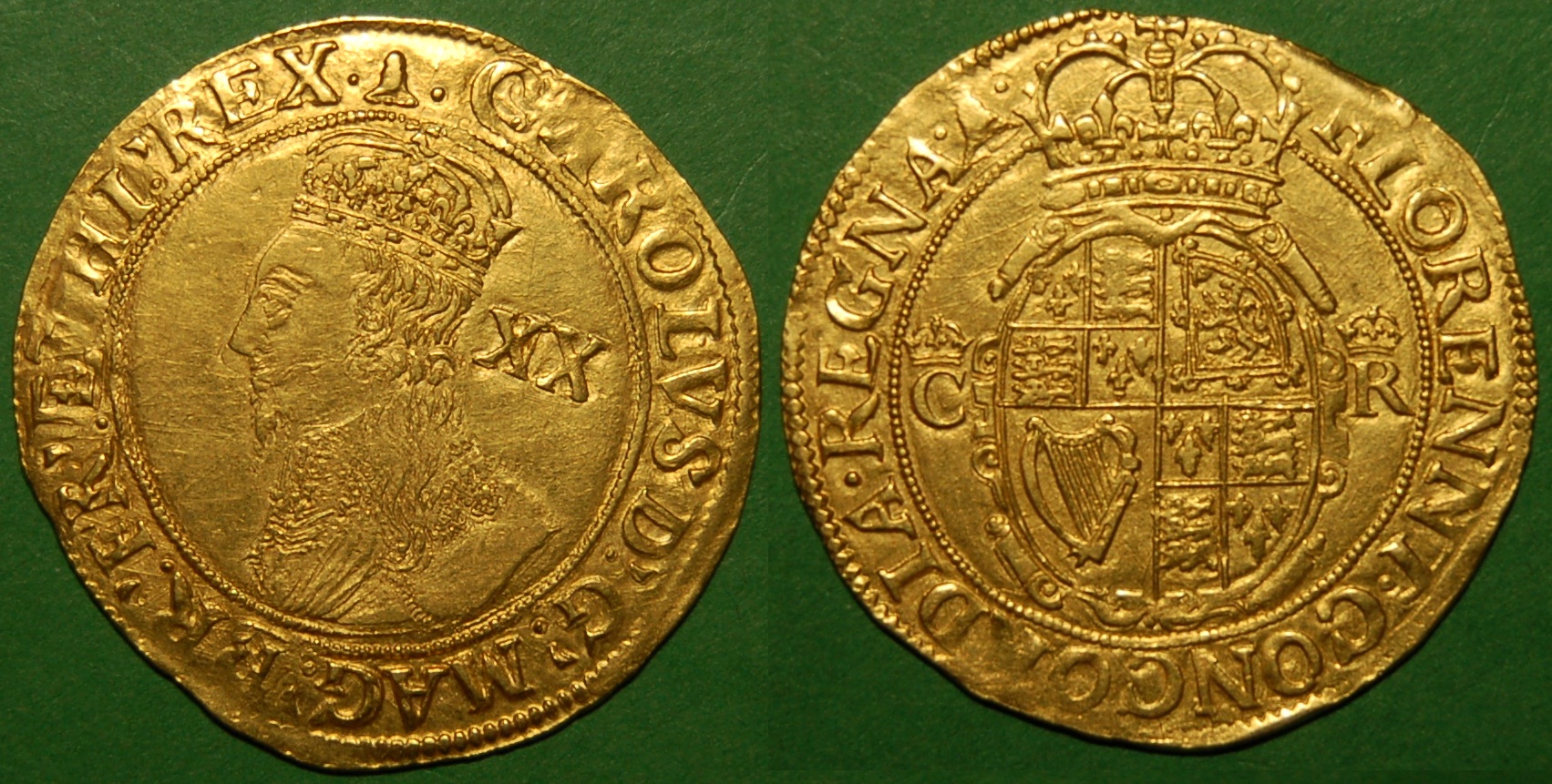 I like a full lustre MS coin whatever metal it's struck in, but like a diverse selection of objects to look at. I stopped collecting shillings and halfpennies as denominations because I got fed up looking at the serried ranks of MS coins that usually only varied in the date. Full red, white or full gold, it still looked too consistent to my eye and still does. Silver does at least tone to a wider colour range - which I find more appealing. Copper does too on occasion. Rest assured, that if everyone collected the same thing, the excess demand over supply would soon ensure the things not on the list of allowed collectables would soon be collected widely. And as this is a sovereign thread, a Charles I 20 shillings piece, but called a Unite at the time. Mintmark Bell, dating it to 1634-5, the reverse has a legend error with FLORENNT containing a surplus N. 2 known. This coin ex- R C Lockett 4451, Glendining 17/10/1961 J G Brooker 90A, collection sold by Spink c.1980 H Selig 28, Spink 70, 31/5/1989