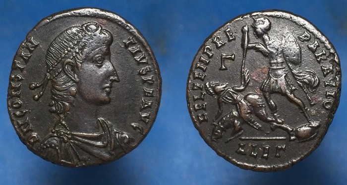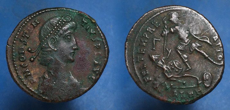 Rev: [K] - ONST Facing bust of Constantine, beardless, wearing crown and chlamys, and holding globus cruciger; C - I on either side of head