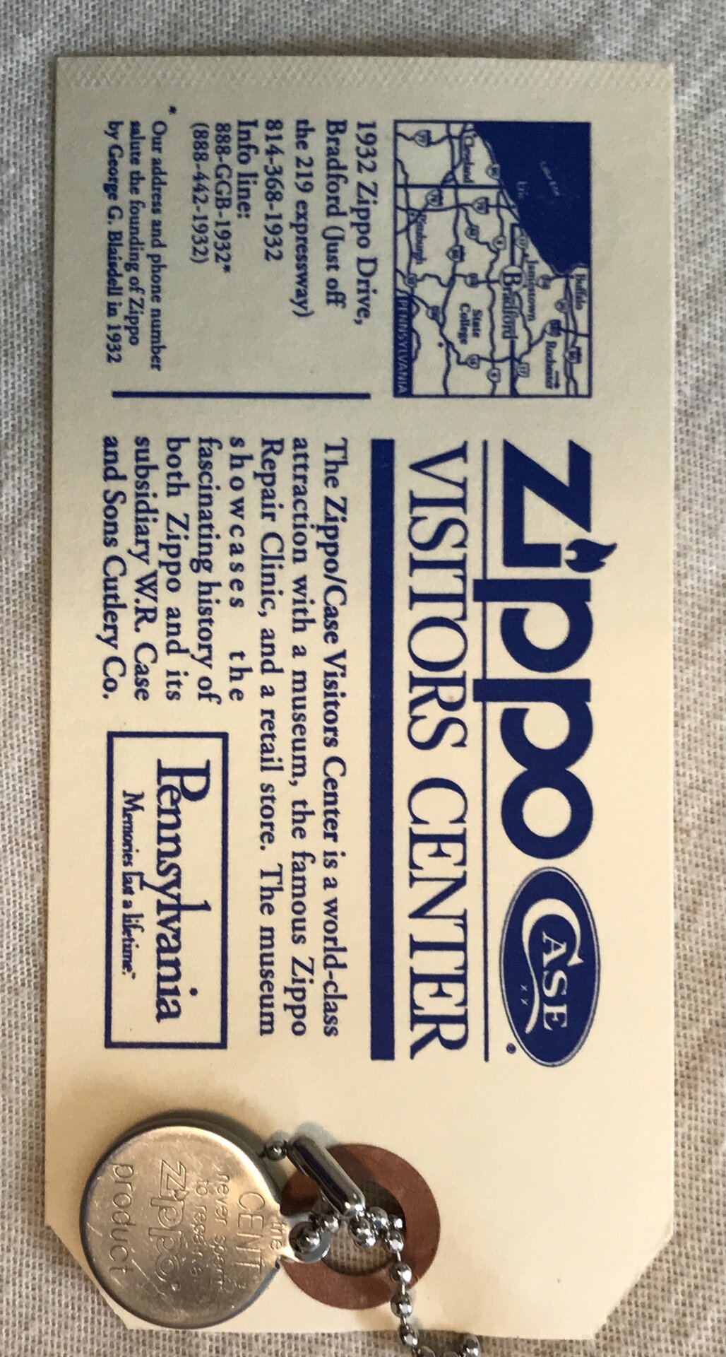 I was going through some old boxes and I opened one that I packed 20-21 years ago. Not much of interest and I recycled a lot but I did keep this. I forgot I had it. A souvenir from the Zippo Lighter factory. An interesting tour and a great piece. I’ve never seen one of these anyway in all my years. The cent is a 2000, the year I went. The reverse case reads: “The CENT never spent to repair a Zippo product”.