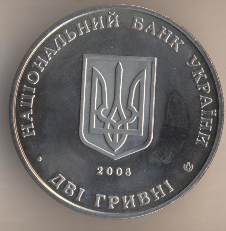 2 hryvni 2008, copper-nickel-zink. Size - 31 mm, weight - 12,8 g., mintage - unknown. "Evgen Petrushevitch".