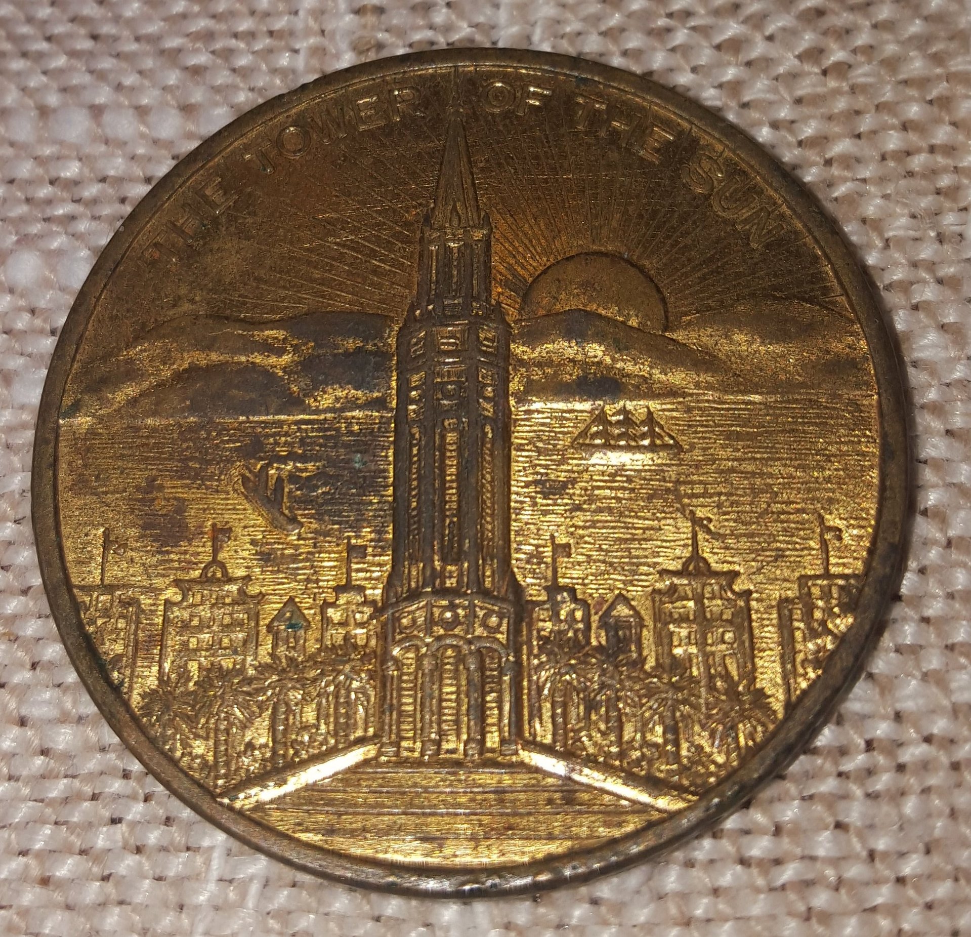 These tokens were made for the San Francisco World's Fair 1939-1940 known as the Golden Gate International Exposition. This one has a similar reverse: Obverse: Golden Gate Bridge, sunset, fair building GOLDEN GATE INTERNATIONAL EXPOSITION 1939 / SAN FRANCISCO BAY Reverse: Tower, modern ship, sailing ship, hills, sunrise THE TOWER OF THE SUN 157C (Type number) Brass, 26mm, 5.86gm