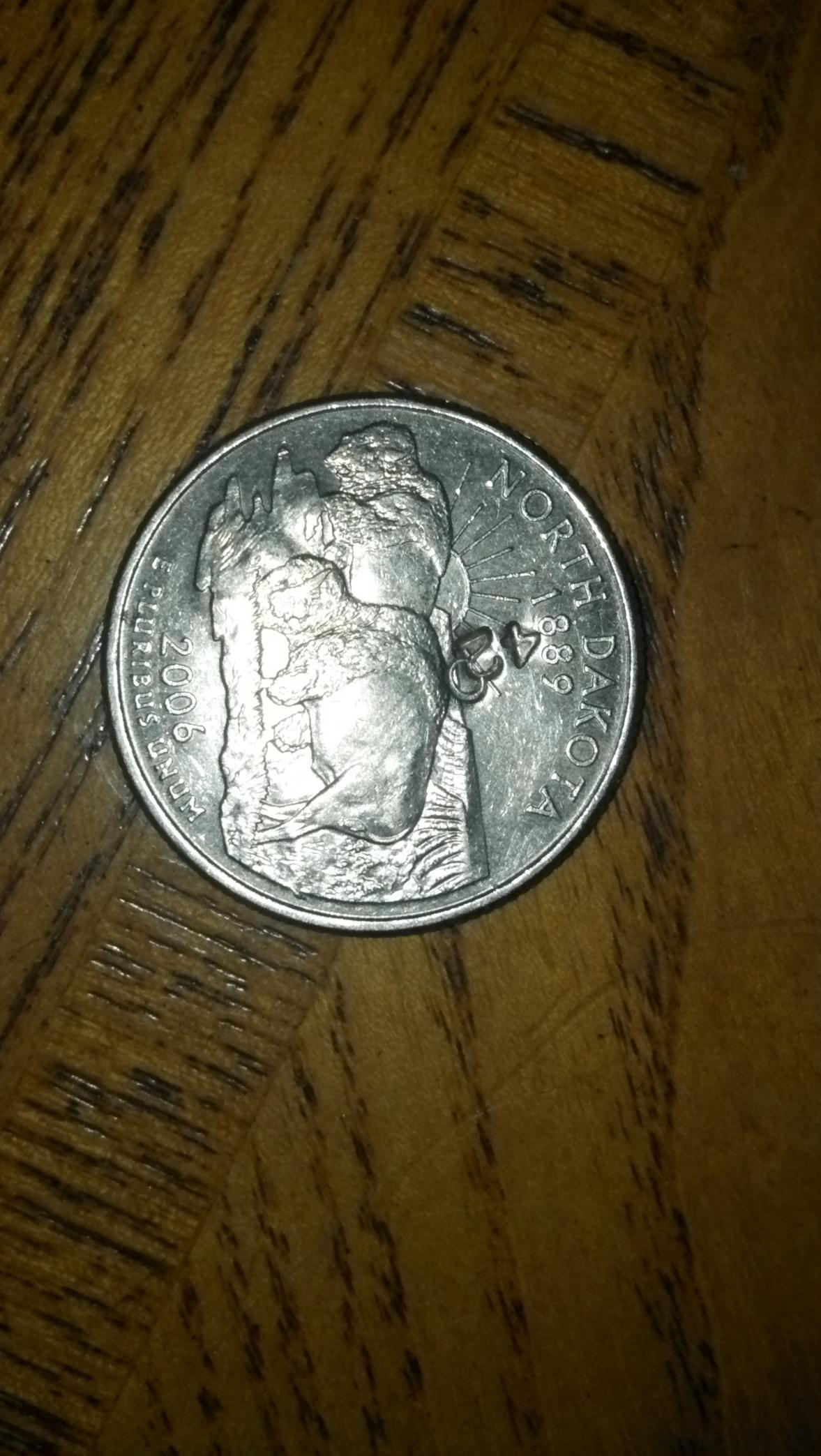 Hello, I was checking my pocket change today, and I found this. I have no idea what it is, or what "420" represents. It's a 2006 North Dakota P state quarter, and on the obverse, and the reverse are the numbers "420" clearly stamped into the quarter. One side appears closer and mashed together, above the Buffalo, and the reverse shows it spread out across Washington's forehead. There's no other damage, nothing around the numbers, it just seems as if they were stamped in. Any help on figuring out or explaining it would be awesome, Thanks!!
