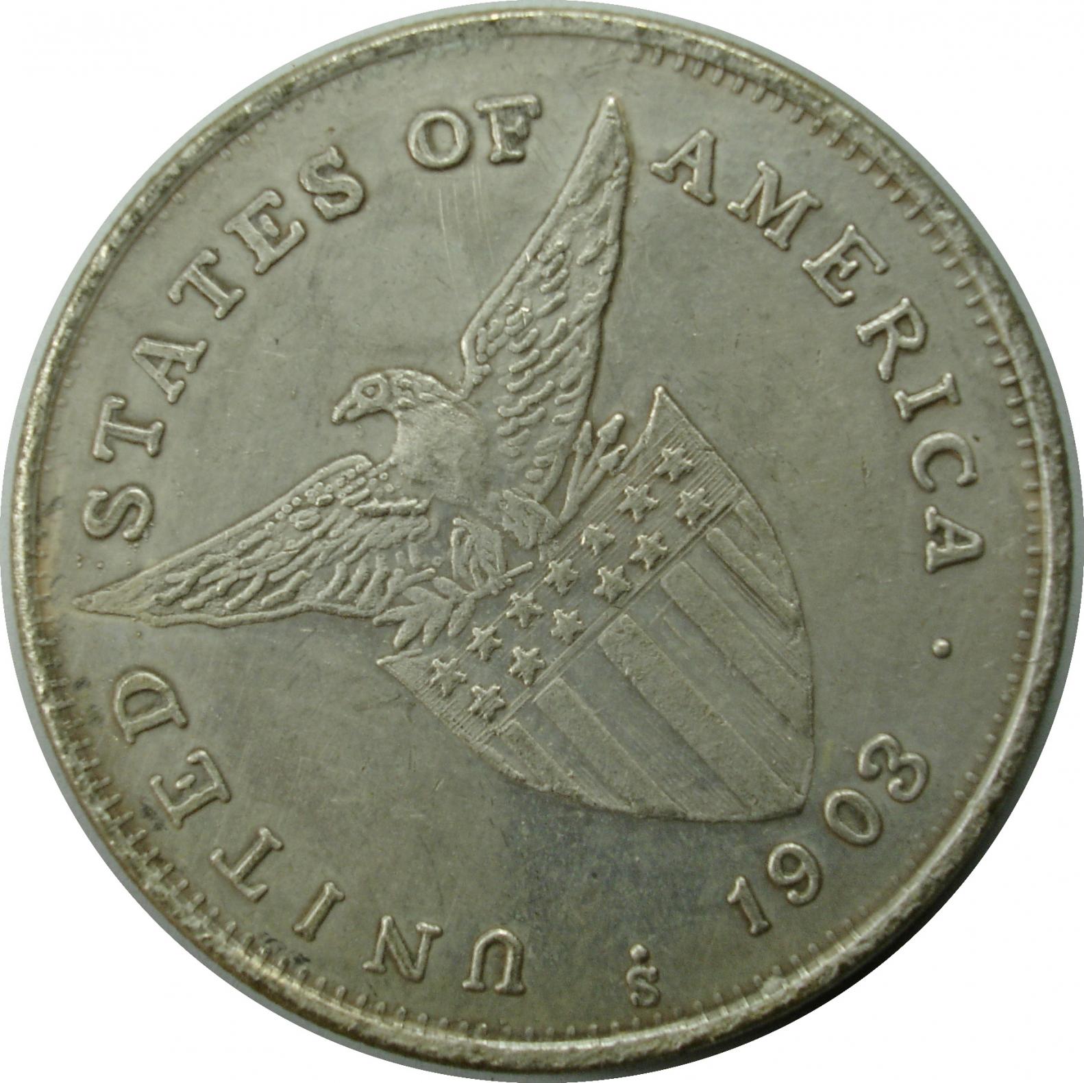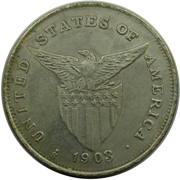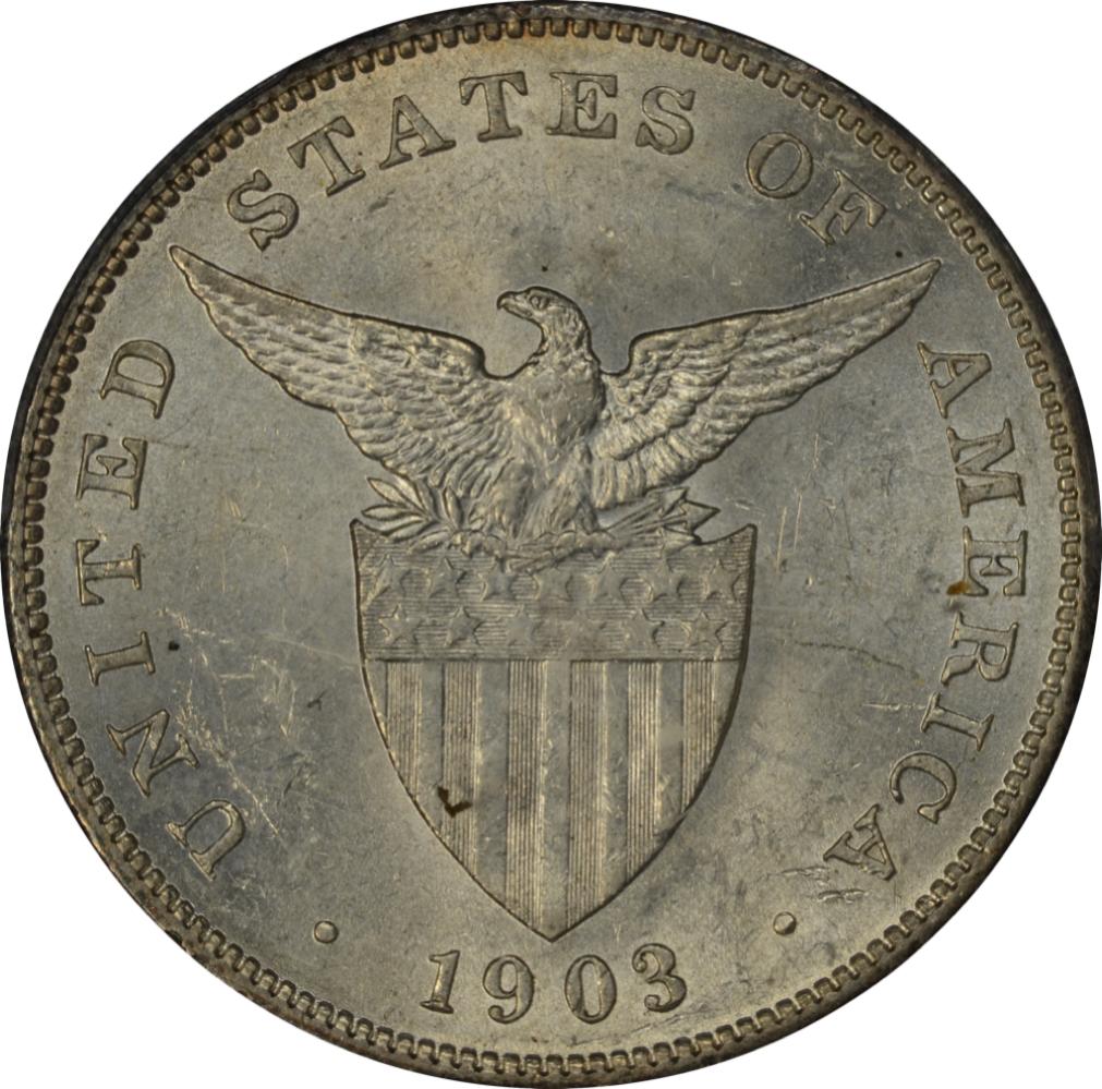 The above coin is an obvious counterfeit that I received in a lot of US Philippine coins. While the obverse (Date Side) is obvious, the reverse was more than likely taken from a real coin. It weighs 19 grams and is made from pot metal. This example has about a 45 deg rotation as can be seen in the pictures. You might think that this would be to obvious to fool anybody, but this was purchased by another dealer (with 40+ years as a full time dealer) and then given to me with a handful of other coins. Apparently it was purchased in a large collection and was just glanced over during the initial purchase. It also means that at least one other collector was also fooled by this example, hence why I am posting this. Below is an example of a real 1903 Peso graded MS61.