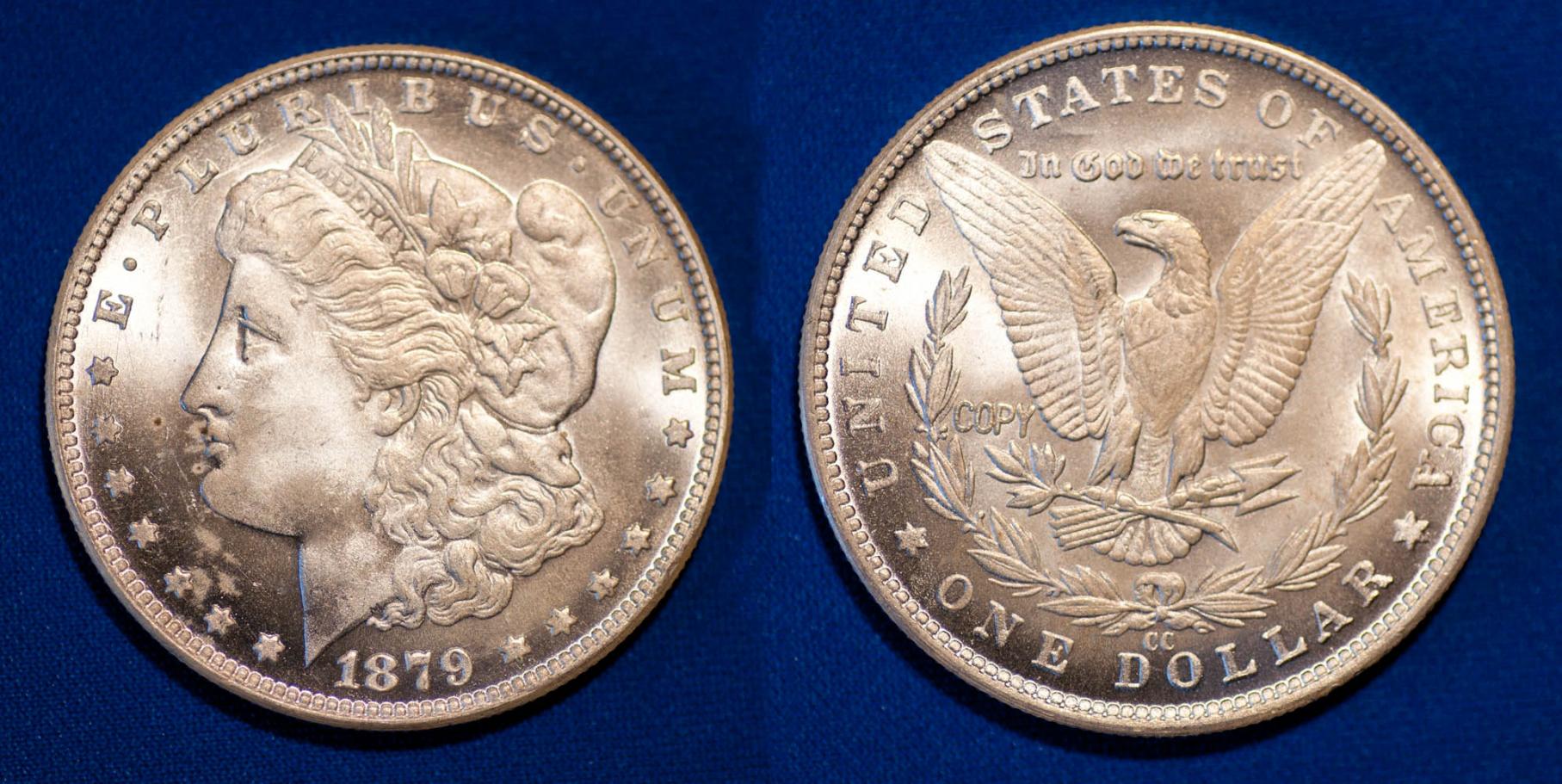 Here is a "1879-CC" Morgan dollar recently manufactured in China. It is properly marked "Copy" but is available without that mark too. The reeding is clean and regular.