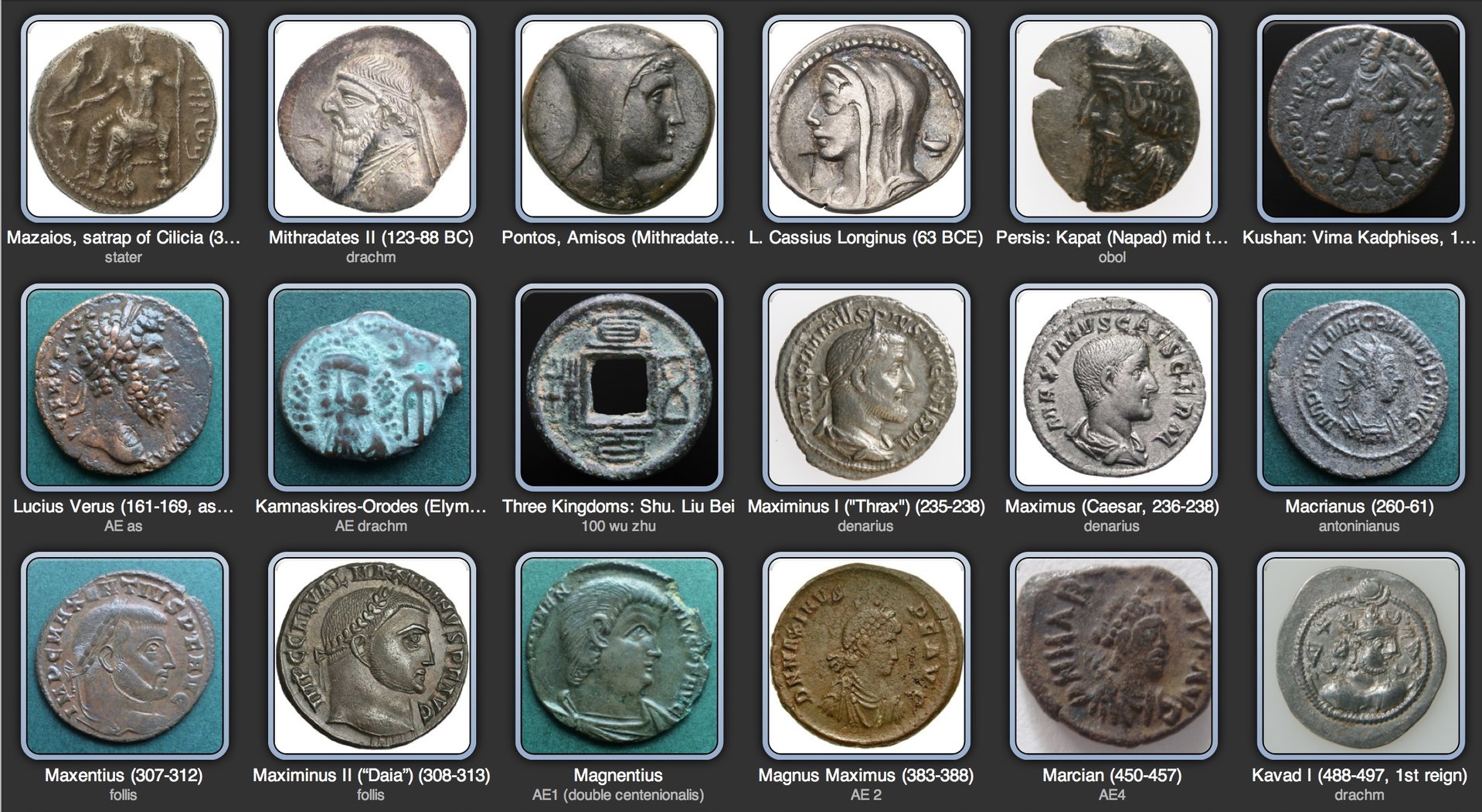 I nearly needed two posts again... wekve got to stop with three letters a day! Kushan Empire Karishka I, r. 128-158 A.D. AE Tetradrachm, 24.73 mm x 16.8 grams Obv.: Crowned, diademed king standing facing, holding spear and sacrificing at altar at left, Bactrian legend around: ϸΑΟ ΚΑ ... ΝηϸΚΙ (King Kanishka) Rev.: Four-armed Oesho (Shiva?) standing facing, head turned to left, nimbate, holding various attributes, Bactrian legend right: ΟΚϸΟ, tamgha at left German States, Osnabrück Bishop Konrad I von Velber, r. 1227-1239 (1236-39) AR Pfenning, 17.71 mm x 1 gram Obv.: SANCT' PE[T']. Head of St. Peter facing holding key Rev.: +CON[RAD]VS EPC'. Voided short cross with quatrefoil in each angle Byzantine Empire Leo VI, r. 886-912 A.D. AE Follis/40 Nummi, 25.92 mm x 6.1 grams Obv.: LEON bASILEVS ROM. Crowned bust facing with short beard, wearing chlamys, holding akakia Rev.: + LEON/ EN QEO BA/ SILEVS R/ OMEON. legend in four lines Ref.: SBCV 1729 Imperial Rome Licinius I, r. 308-324 A.D. Rome Mint, AE Follis, 22.1mm x 3.2 grams Obv.: IMP LIC LICINIVS PF AVG, laureate head right Rev.: IOVI CONSERVATORI AVGG NN, Jupiter standing facing head left, chlamys on shoulder, holding Victory on globe and leaning on scepter, eagle with wreath l, A in right field, SIS in ex. Imperial Rome Licinius II as Caesar, r. 317-324 A.D. (317-320 A.D.) Antioch Mint, AE Follis, 18.12mm x 3.0 grams Obv.: D N VAL LICIN LICINIVS NOB C, diademed bust left with mappa & scepter Rev.: IOVI CONS ERVATORI CAESS Jupiter standing, head left, with Victory, captive at feet, Δ to right. Mintmark SMANT Byzantine Empire Manuel I, r. 1143-1180 A.D. AE Tetartera, 18.18 mm x 3 grams Obv.: MANVHL DECPOTH, Manuel, crowned and wearing loros, bust facing, holding labarum and cross on globe Rev.: Barred IC - barred XC to left and right of cross with X at centre, on three steps Ref.: SBCV 1982 Ex. DC Collection Portugal Manuel I, r. 1495-1521 AE Ceitil, 18.06 mm x 1.4 grams, Group 3.1 Obv.: +IEMANVEL R.P.ET.A. N retrograde. 3rd type shield containing Portuguese coat of arms, annulet left, top, and right Rev.: +I:EMANVEL.[R.P.ET.A.]. N retrograde. Group 3.1 castle with high open outside wall castle over convex sea Byzantine Empire Maurice Tiberius, r. 582-602 A.D. (595-596 A.D.) Theoupolis / Antioch Mint AE Follis/40 Nummi, 27.35 mm x 11.4 grams Obv.: Ꝺ N MAVΓI CN P AUT. Crowned bust of Maurice Tiberius facing, wearing consular robes, holding mappa with his right hand and eagle-tipped scepter in his left Rev.: ANNO left, XIIII right, tHEUP’ in exergue. Large M center, cross above, Γ below Ref.: SBCV 533 Imperial Rome Maximian, r. 286-310 A.D. (291 A.D.) Rome Mint, Billon Antoninianus, 21.35mm x 3.1 grams Obv.: IMP MAXIMIANVS P F AVG, radiate, draped and cuirassed bust right Rev.: HERCVLI PACIFERO, Hercules standing left holding branch and club, lion skin over arm, XXIε in ex. Kingdom of Bactria Menander I r. c. 165/55-130 B.C. AR Drachm, 15.71mm x 2.5 grams Obv.: ΒΑΣΙΛΕΩΣ ΣΩΤΗΡΟΣ / ΜΕΝΑΝΔΡΟΥ. Diademed bust of the sovereign right, coat fastened on the right shoulder Rev.: (Maharajasa tratarasa / Menamdrasa). Athena Alkidemos standing left. Monogram 'H' in right field Ref.: Bopearachchi, Ménandre (I) Sôter, 67
