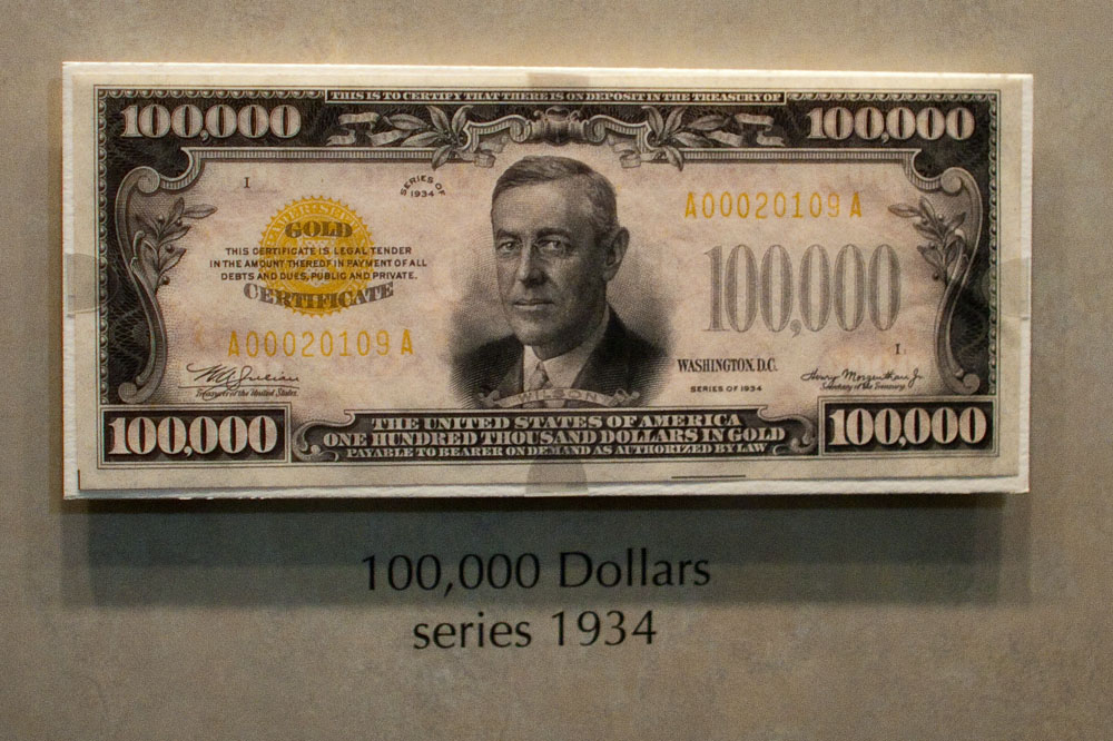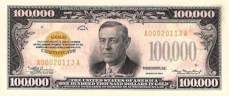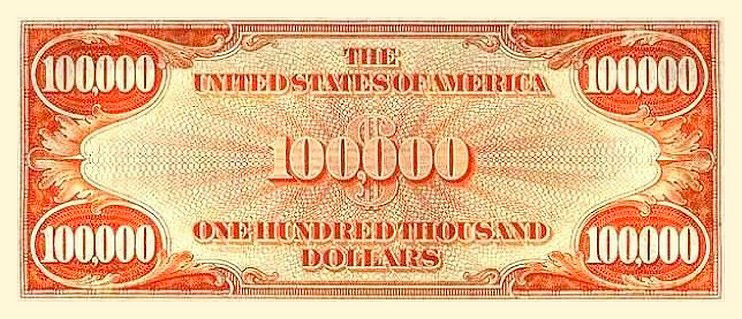 This note has always been #1 on my list of favorites in the U.S. currency note 'small-size subclass'. I have always found this bill very compelling and never get tired of looking at it. I actually had a digital copy made for me a few years back. I've been thinking about having it framed and hanging it on my wall. I love the way this looks: from the seriousness of Wilson, the Gold Certificate seal, the bright orange back, and of course all those 0's. This bill just speaks the year "1934" to me. Money was really wonderful back then (with Silver and Gold Coins in circulation) and Gold and Silver Certificates for currency. Although I think all gold coins were recalled in 1933? Funny that this bill is dated 1934, even though the gold coins were recalled the previous year. Some fun facts: The 1934 $100,000 Dollar Gold Certificate is the highest U. S. denomination currency note ever made. Only 42,000 were printed. These notes were used only for transactions between the Federal Reserve and the Treasury Department; and were never issued for public circulation. When the U.S. Government stopped using them in the early 1960s, most were destroyed. Only a few are known to have survived. The surviving notes are housed at the Federal Reserve Bank of San Francisco, the Bureau of Engraving and Printing, and the Smithsonian Institute. It's illegal for a private person to own one of these notes, and none has ever been in private hands. All 42,000 were accounted for when they were collected (and almost all burned). You know I think the Treasury Department is stupid sometimes. They could have just issued a blanket cancellation on this series, and then sold the bills to collectors for $500 each. That could have put $21 million dollars in their coffers. I am sure there were 42,000 currency collectors out there that would cough up some bucks a have a piece of this history. Instead they burn them -- what a waste.