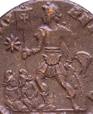 Fascinating -- you should write an article! On my Septimius Severus, what is the captive on the left holding in his or her arms? It looks almost like an inflated life preserver! And then there are captives like this guy on my Licinius II follis who appear to have no arms at all, unless his arms are intended to be those two lines meeting in a V at the bottom of his neck. Or this guy on my Honorius solidus (RIC X 1287 ) with the Emperor's foot pressing into his groin -- as if Honorius ever got within a mile of a captive! -- in one of the apparently endless different captive positions on such solidi. I describe it as "bound barbarian captive seated left on ground with both legs visible and sharply bent at knees (bent right leg is raised upright; bent left leg lies flat on ground with left knee extending below exergue line and left foot resting against right leg." Nobody knows what, if anything, the different positions mean. As I noted in my description, this captive type "does not seem to be included in the list of captive types (a)-(d) associated with RIC X 1287 (list is under RIC X 1205 at p. 318), or in expanded list of captive types (a)-(g) for RIC X 1287 at Wildwinds; see http://www.wildwinds.com/coins/ric/honorius/solidi_table.html: “a = captive: one leg crossed over the other [from RIC] b = captive: two parallel legs [from RIC] c = captive: one leg visible, more or less straight [from RIC] d = captive: one leg visible, sharply bent at the knee [from RIC] e (added) = captive: kneeling f (added) = captive: sitting g (added) = captive: one leg straight, one leg sharply bent at the knee” The captive type on this coin -- with both legs visible and sharply bent at knee, one of them with the knee upright and the other with the knee flat on ground -- simply does not fit in any of these categories. I have made no attempt to review the 400+ examples of RIC X 1287 at ACSearch to determine if there are any with the same captive type as mine." For all I know, the differences mean nothing at all. Edited to add: I also have coins with captives like this dwarfish pair on a "centenionalis" of Constans, for which I describe the reverse as depicting "Emperor in military dress, standing left and holding labarum in right hand and shield in left, placing right foot on leg of one of two captives before him with hands bound behind their backs, wearing caps and kneeling facing with their heads turned towards one another." Are the caps "Phrygian"? Not sure.