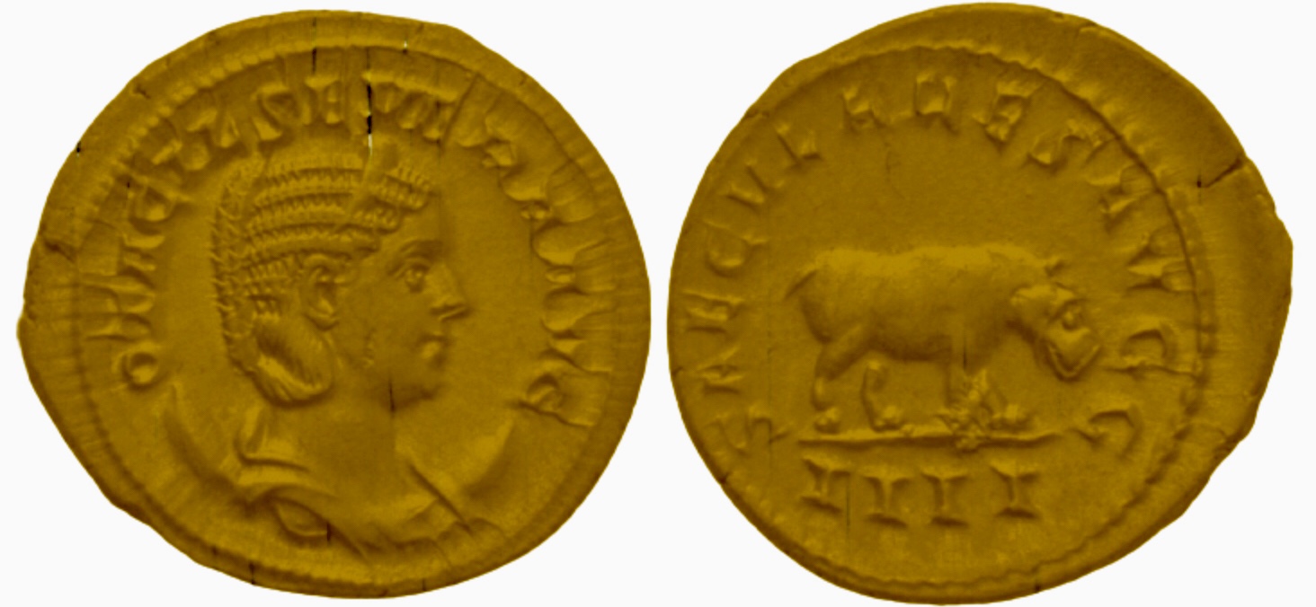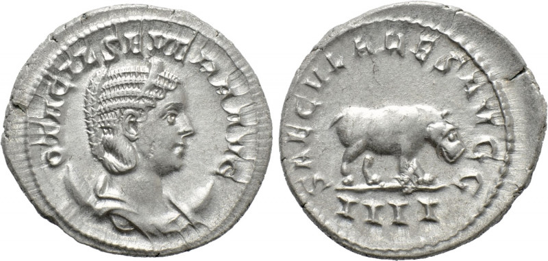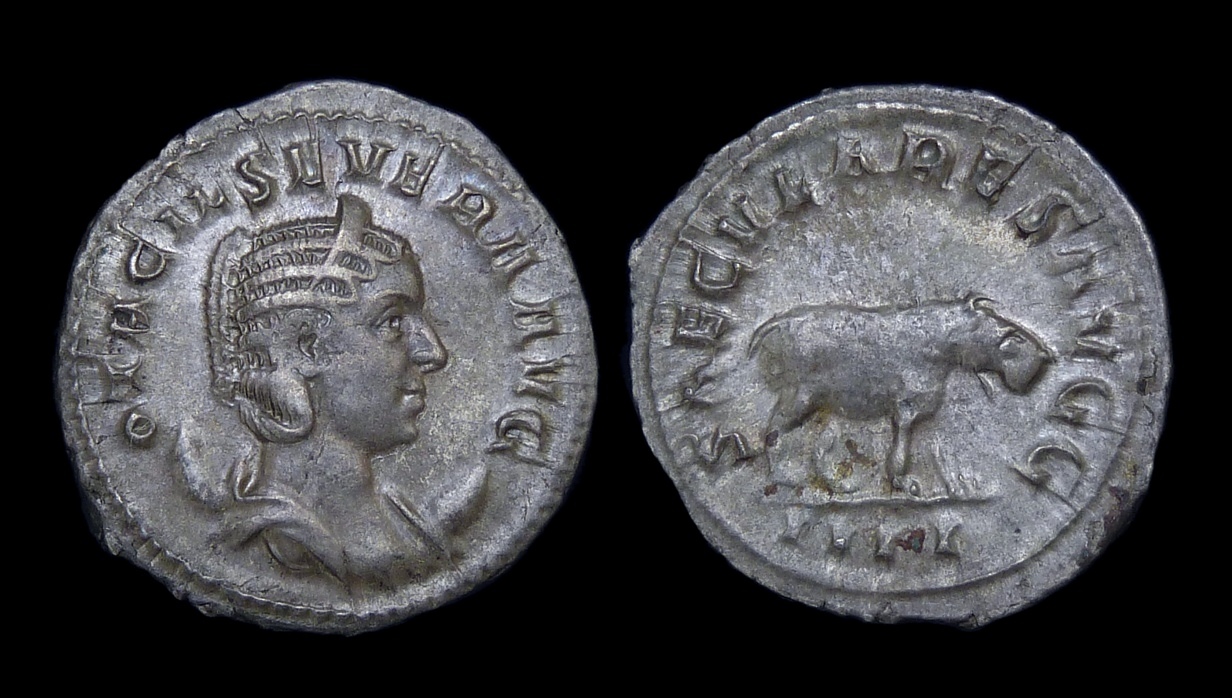 I have been trying to get this for five years.... From Naumann event today/ my proxy bid of 400 euros held up. AR Antoninianus ND Roma Mint 4.29g. 23mm. .400 OTACIL SEVERA AVG. Draped Bust Right/ wearing Stephane and set upon Crescent SAECVLARES AVGG/III Hippopotamus advancing Right RIC 116b Otacilia Severa Augusta 244-49 Saeclar Games/ 1000th Anniversary of Rome Issue