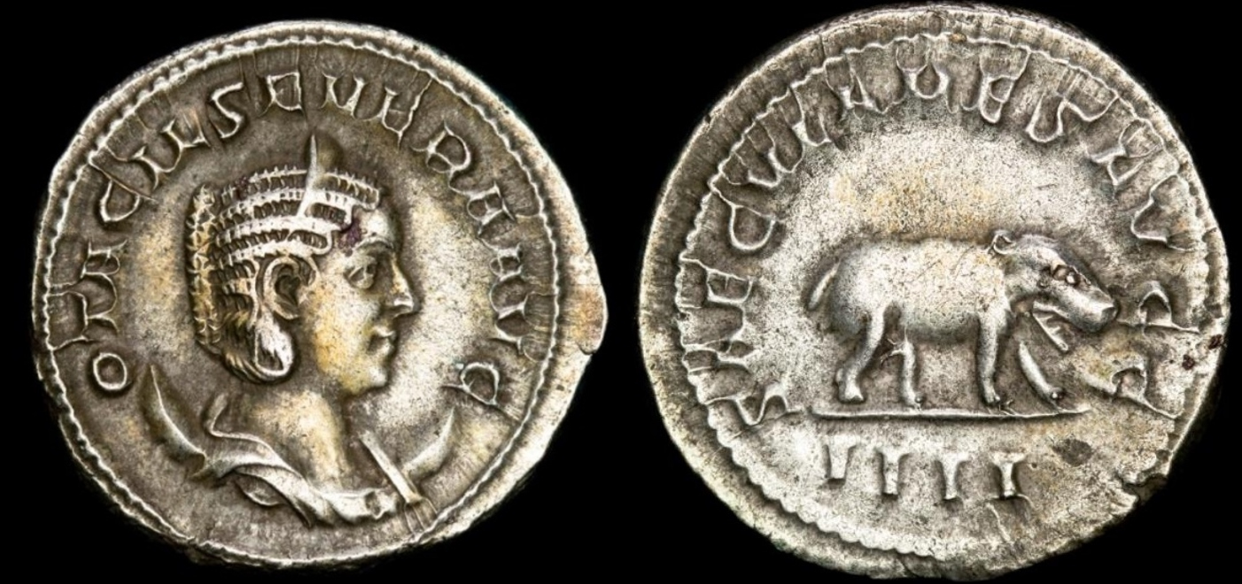 @panzerman, a great example of the "closed-mouth" variety. Much friendlier-looking than mine, which is baring its teeth rather aggressively: Otacilia Severa (wife of Philip I) AR antoninianus AD 248, Rome mint, 4th Officina. Obv. Draped bust right, wearing stephane, crescent behind shoulders, OTACIL SEVERA AVG/ Rev. Hippopotamus standing right, mouth open, SAECVLARES AVGG; IIII in exergue. RIC IV-3 116(b), RSC IV-3 63, Sear RCV III 9160 (ill.). 23 mm., 4.52 g. (Games commemorating 1,000th anniversary of founding of Rome.) The two types also appear to have very different styles of lettering, despite being from the same Officina.
