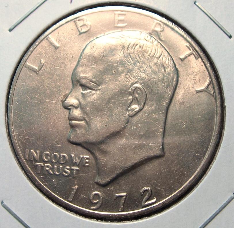 So I've been more or less searching for a 72 Type 2 Ike for a while (despite already having an ANACS graded March dies example in my collection) I've really wanted to find one at face value cause thats how I roll :devil: Well...I finally got one!! Funny thing is that a friend of mine that works at a bank saved me 195 Ikes that a customer recently brought in. I was looking through those and most were bicentennials and 72's...my thinking was they were probably saved by someone that thought those might be worth something one day or they were looking for a type 2 as well (because literally 40-50% were 72's). Well there was nothing good there. I even checked the 2 or 3 71D's for the friendly eagle...no dice. So I go to dump the 195 into the bag I had around 100 Ikes in already that I got maybe a year ago. The plan was to take them to the bank and cash them out for some silver or gold. I paused and said to myself.. "ummm I don't think I ever checked the 100 in the bag!" Well I don't know if I ever did or not, but the 2nd to last coin was a 72. And viola! A type 2!! Low-end AU (and Ike has some schmootz on his nose), but I'll take it any day!