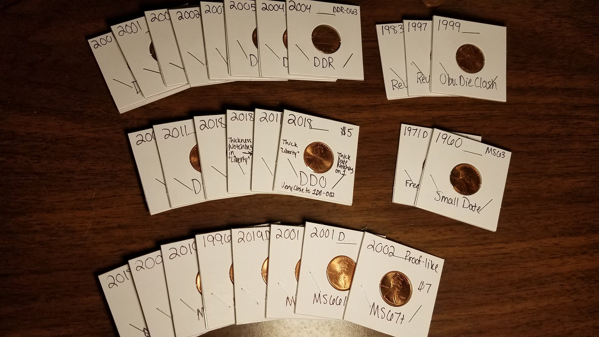 At the end of the first box of pennies of the year, I found: 8 doubled die reverses, 6 doubled die obverses, around 10 high ms or toned coins, 2 reverse die clashes, one obverse die clash, a struck through cloth, and a 1960 small date in bu condition. Not bad... I attached some photos, obviously not all of them.