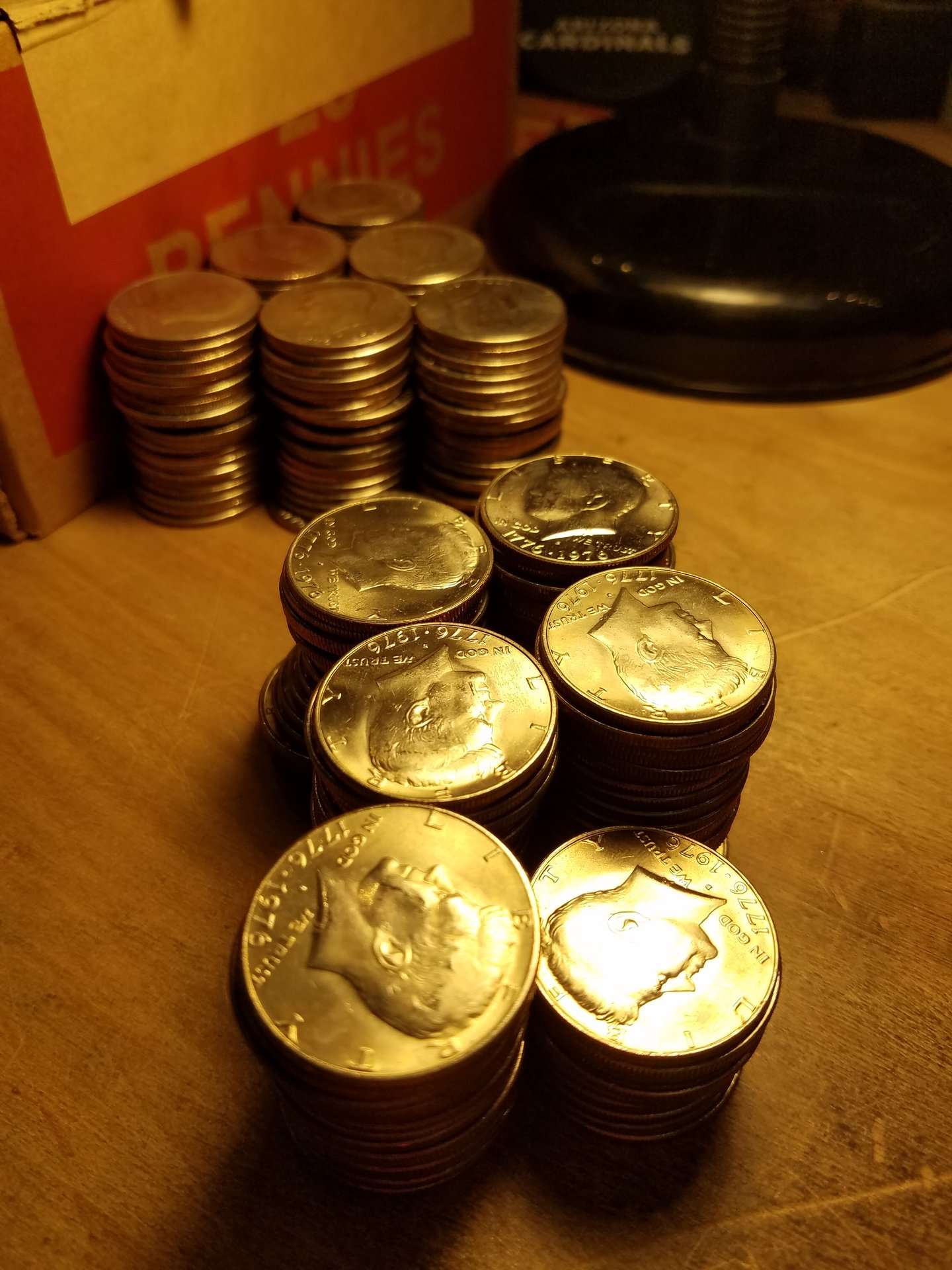 I went through my first box of half dollars and did not find any silver. But I did find a lot of Bi-centennial halves. I did not find any "S" mint. I found about 125 bi-centennial's and another 112 bi-centennial's that are very shiny. Not sure if they are proofs? Or do proofs only come with the "S" mint mark on them? So I found about 237 bi-centennial's in one box. I think that is a lot for one box or not? In the first picture with the two halves, the bottom one is one of the shiny one.