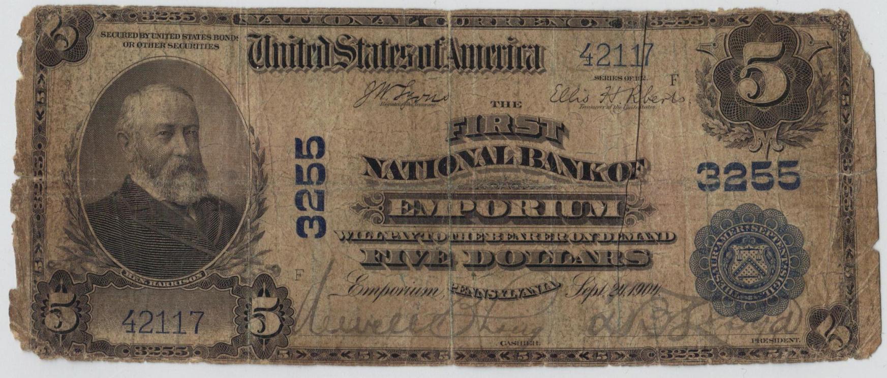 Just bought this the other day. I'd been looking for more than ten years for a banknote from this town, Emporium, PA, and had not been able to find one. This bank issued $5 and $10 large sized notes only and according to a Heritage auction of a similar example there are 10 or fewer notes in all denominations known to exist for this bank, explaining my trouble finding one. Now if I could just find a $10 note to go with it! My wife's family is from this town which is why it's significant to my collecting goals.