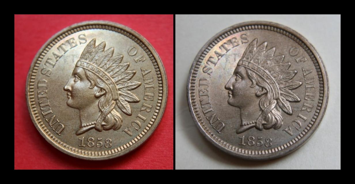 Love a good mystery! I put the two coins together and FWIW I see a remarkable similiarity in the two pics. I don't think either ones been photoshopped with a different backround as you can see the shadows of the coin. They both show very similiar lighting both in quality and direction. The only difference is the white balance which you would get using an auto setting with two different color backrounds. If I were to guess, I would say the same photo setup was used for the two pics.