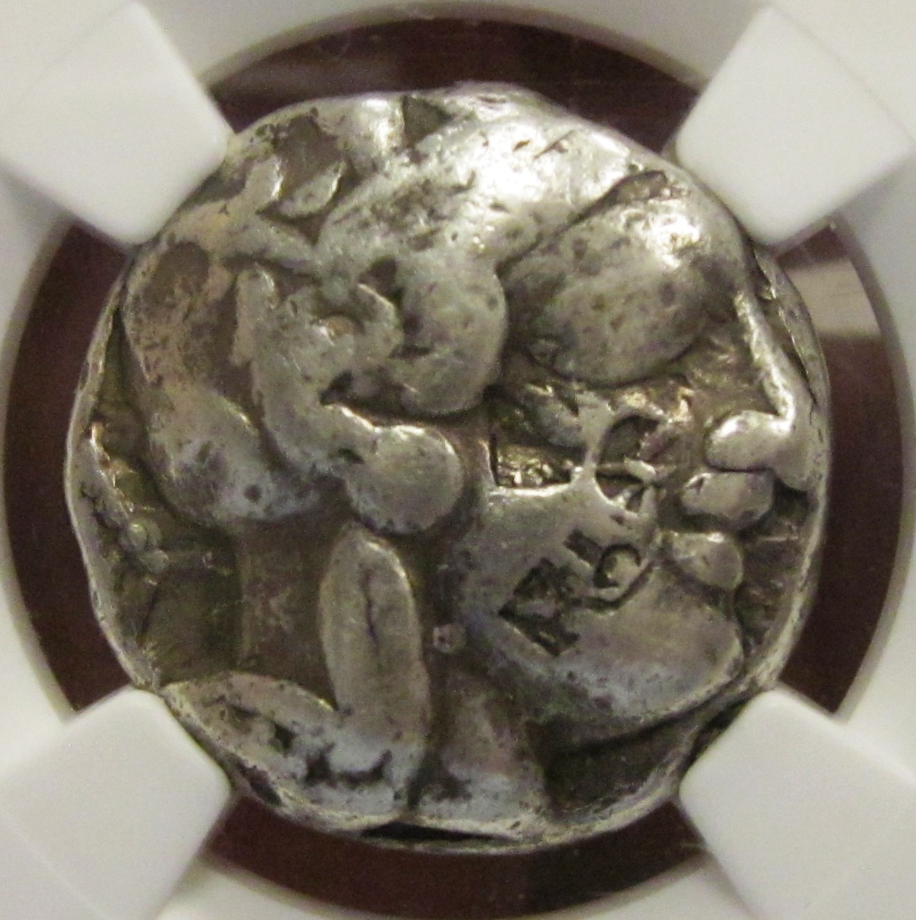 @Ancientnoob traded this coin to me some time ago. I never removed it from the slab. Of course it is an Athena/Owl Tetradrachm with a bunch of marks and test cuts. I like the little bucranium on Athena's cheek.