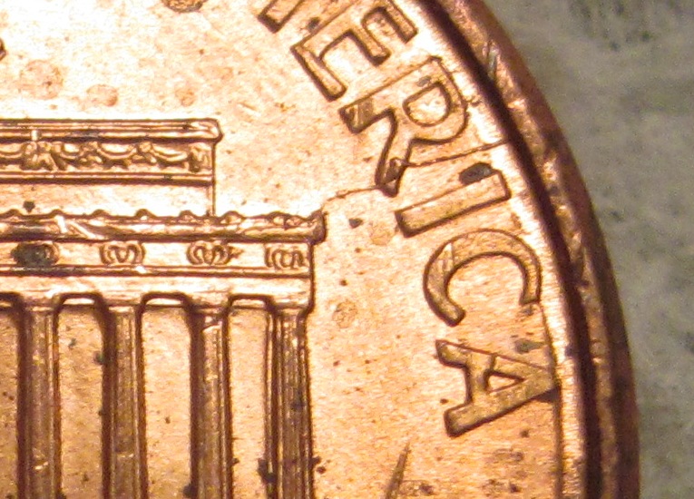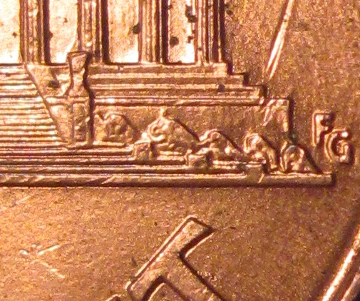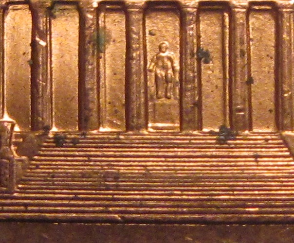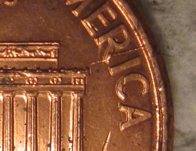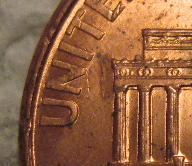 Ok here are a few more of the errors on the coin. The first has a die chip/blob in between the colum to the left of Lincolon. Second has a chip/blob on top of the second bush from the left. Finally the third pic seems to have some die trails in the FG that are clearly seen. There are other areas that have some trails but I have no pics of it that you can see them well.