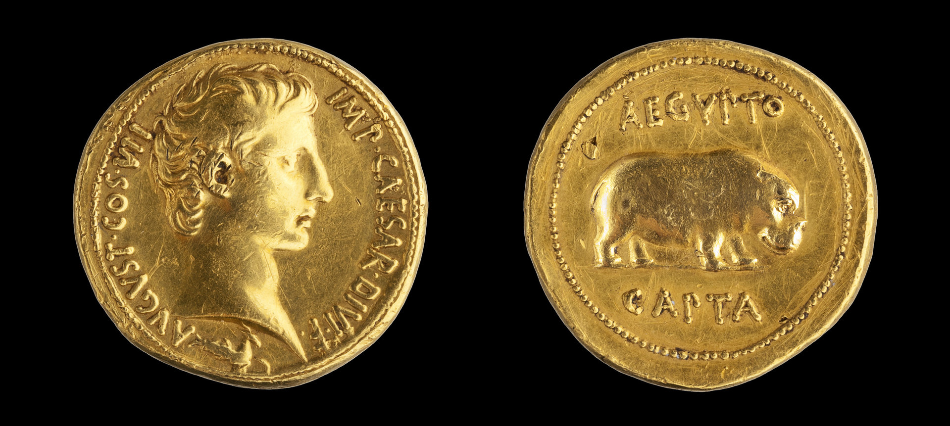 Gold multiples are extremely rare. There are only three known examples from the reign of Augustus, each presenting different typologies, meaning that this quaternion — or four aurei – is unique artefact. These multiples were not used as coins, even though they circulated in the monetary system. They were created to be given as gifts to people close to the emperor. The obverse depicts a young and fresh-faced Octavius accompanied by a small Capricorn, referring to his astrological sign. The legend cites his seventh consulate, allowing us to date its production to 27 BC, precisely when he received the title of Augustus. The style of the portrait suggests that it could have been minted in a Greek workshop in Asia Minor, perhaps Pergamon. The last message of the quaternion is revealed on the reverse: the Egyptian inscription with the words ‘conquered Egypt’ and an hippopotamus, a typical animal from the Nile, commemorate the conquest of Egypt three years before. The annexation of the final kingdom that emerged from Alexander the Great’s legacy was a crucial moment in the rise of Octavius.