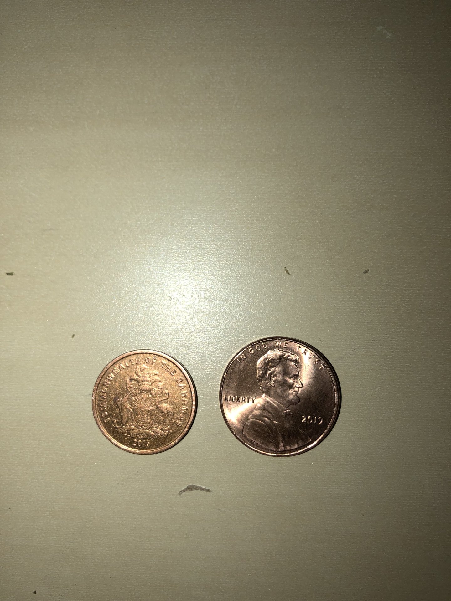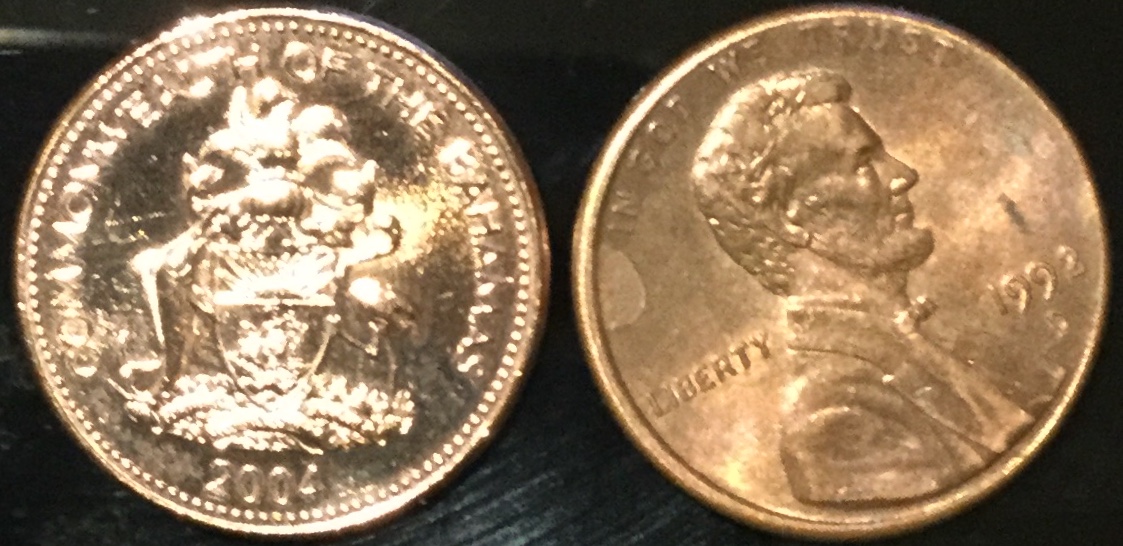 I see regularly encounter Bahamian coins here (SE Florida). I also frequent the islands from time to time. Here is a pic of a Bahamian penny I came across today, and a penny I got in change today. They are clearly not the same size. Not even close.