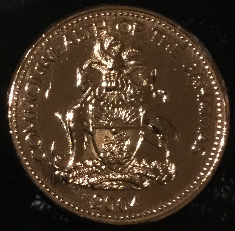 This coin was found in a roll of US pennies. IT'S THE SAME SIZE. Country The Bahamas Type Standard circulation coin Years 1985-2004 Value 1 Cent 0.01 BSD = 0.010 USD Metal Copper plated Zinc Weight 2.50 g Diameter 19.00 mm Thickness 1.40 mm Shape Round Orientation Medal alignment ↑↑
