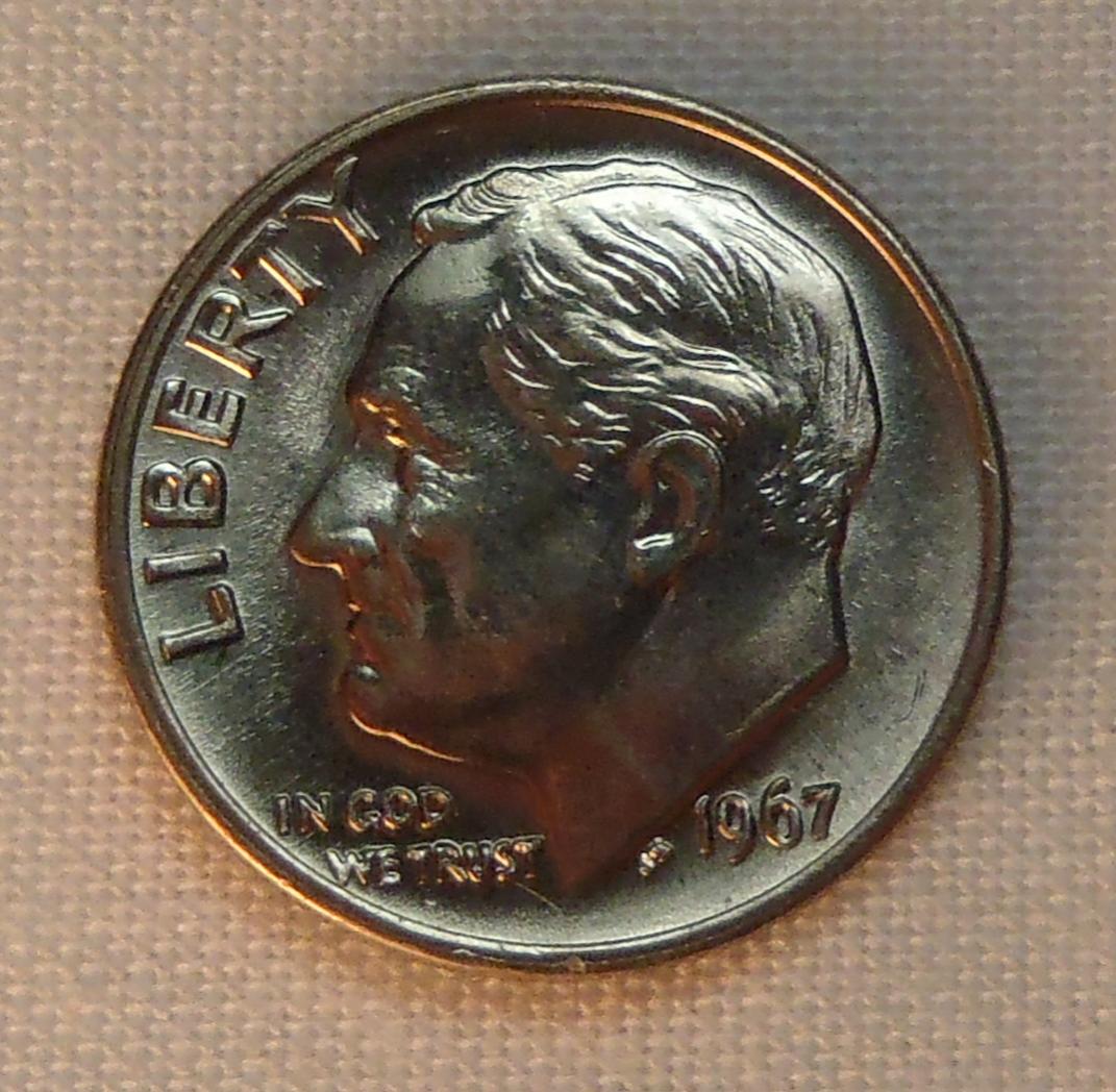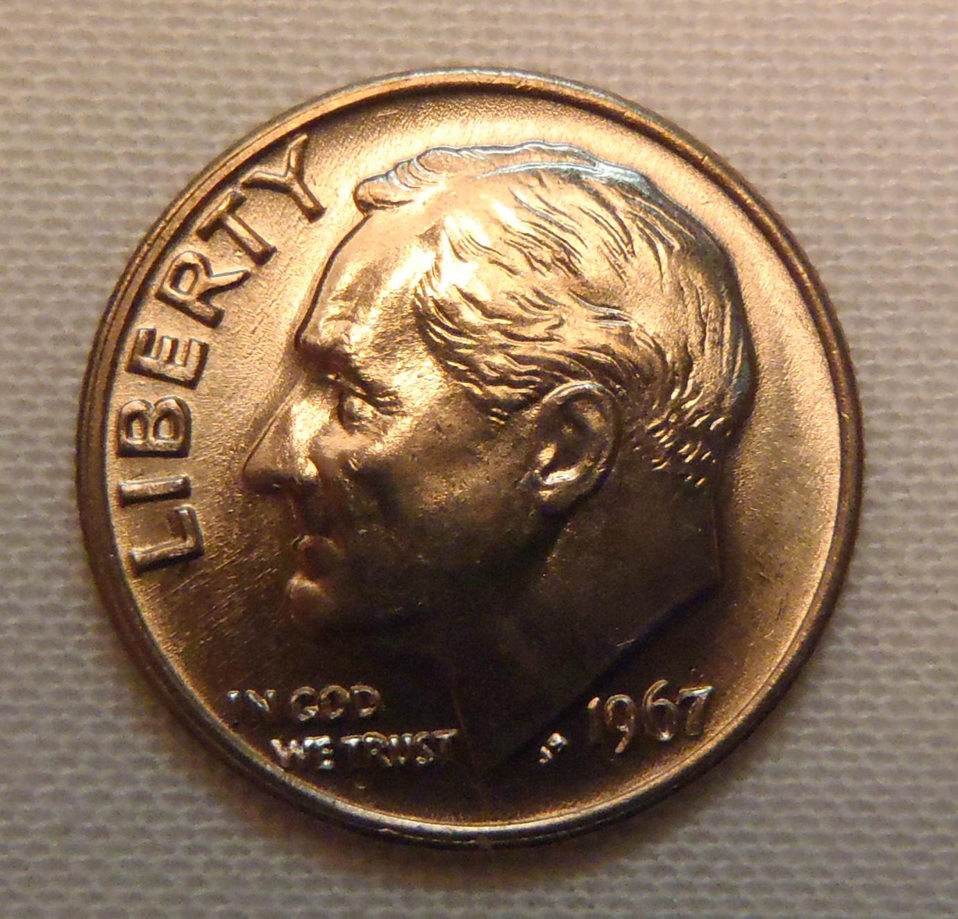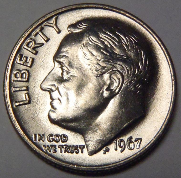 Nice circulation find! I'd call it a 65... Shot at a 66 if it weren't for the rim hit at 3 o' clock and a few scuffs on Roosevelt's cheek. Also, looks like some serious die scratches on the reverse! Guess a die polisher was a bit peeved the day that coin was struck way back in '67! -Brian