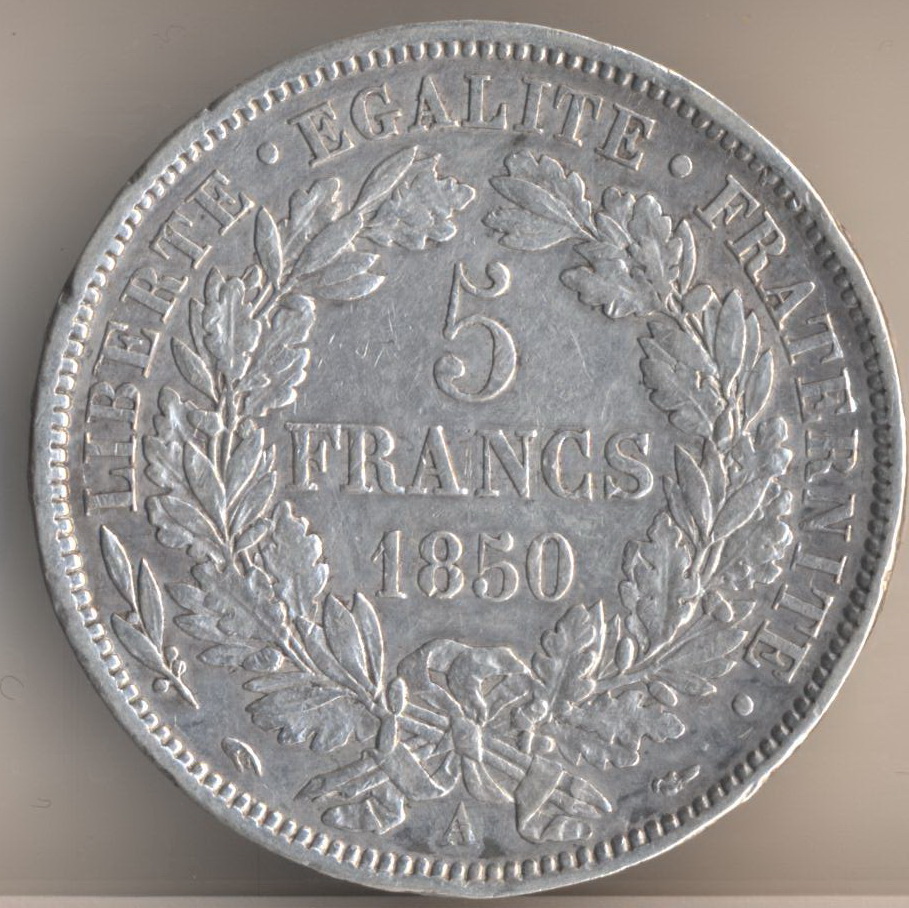 From left to right (most recent to oldest): 5 Francs. 1875-A (Paris). Y 52.1 - 25 grams 0.900 fine (0.7234 oz AGW). Augustin Dupres's allegorical figures of Hercules, Liberty and Equality. 5 Francs 1856-A (Paris). Y 26.1 - 25.0 grams 0.900 fine. Bouvet's portrait of Louis-Napoleon Bonaparte as Napoleon III Emperor. Reverse: Crown over Draped Eagle of Empire with Crossed Scepters of Empire. (In case you missed the words "Empereur" obverse and "Empire" reverse.) 5 Francs 1837-A (Paris). Craig 204.1 - 25 grams 0.900 fine. Pomard's portait of Louis-Phillipe, Duke of Orleans, and "Citizen-King." Edge inscription: "Dieu protege la France." Ecu. Louis XV. 1732 Plus 9 = 1741. Rennes Mint. 6 Livres at 30 grams .916 fine (actual weight 28.79 grams).