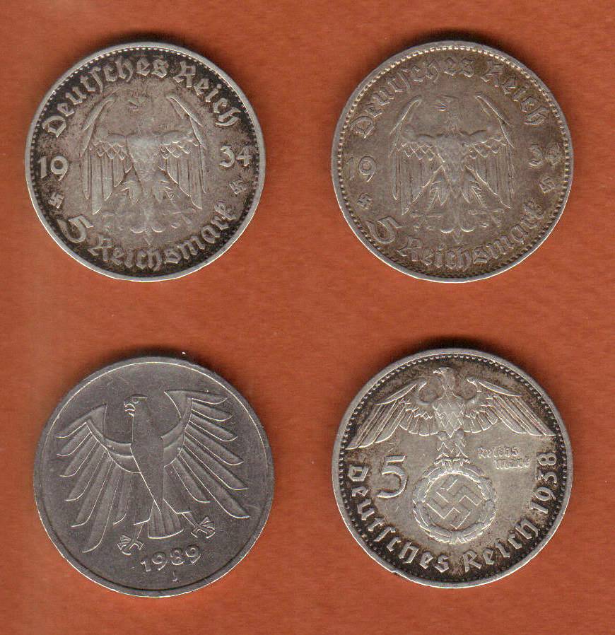 1934-A // KM-83 // 0.4016 Troy oz 1934-D // KM-83 // 0.4016 Troy oz 1938-E // KM-94 // 0.4016 Troy oz 1989-J // KM-140.1 // no silver content All are average circulated F-VF. Shipped ONLY to the United States. PayPal or money order. Price, $48 postpaid and insured.