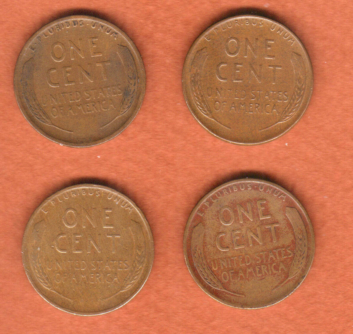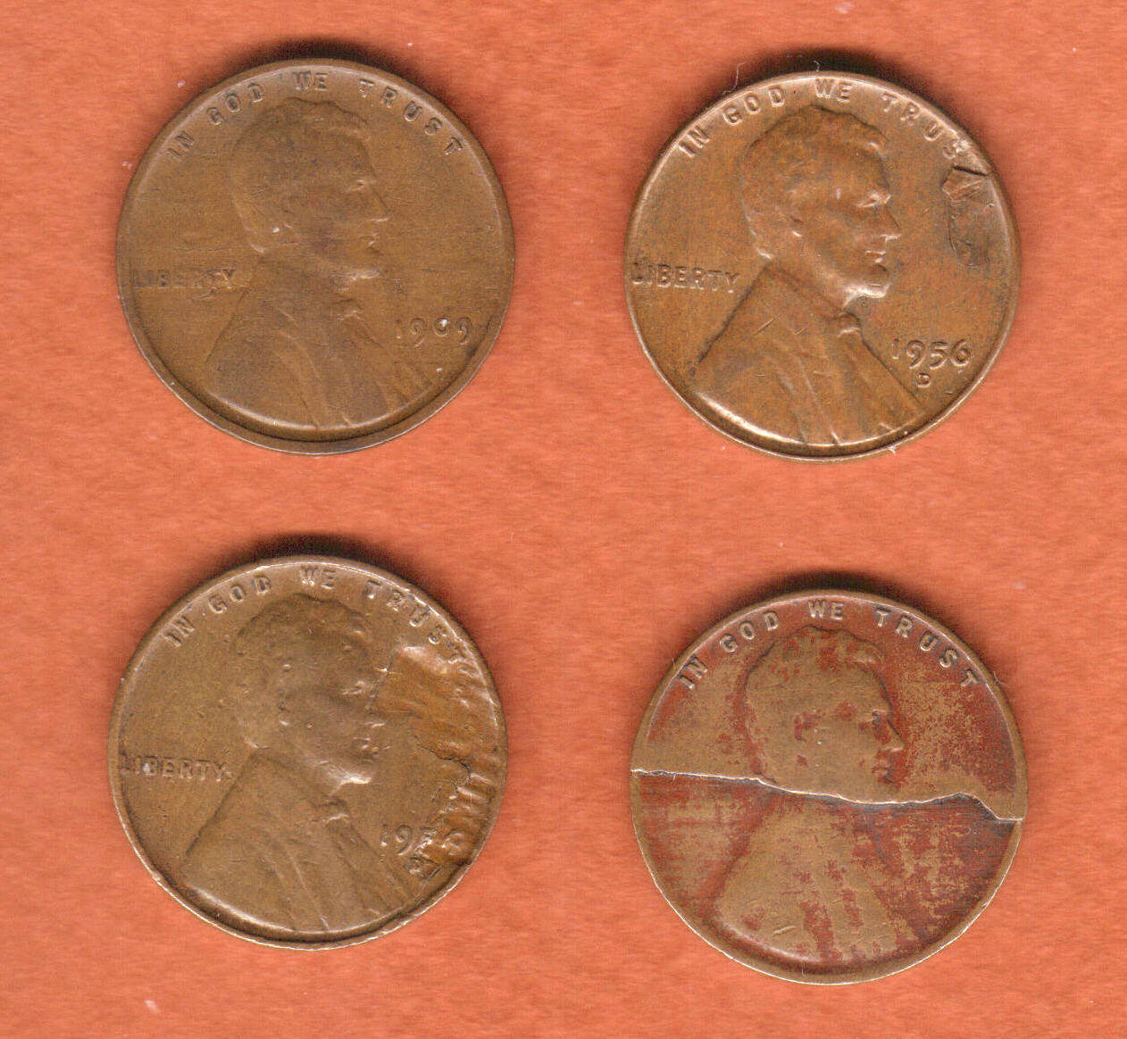 1909-VDB; horizontal line through Lincoln's lips; area below RT of Liberty; area right of Lincoln's chin; area below 19 of 1909; other minor lines. No laminations on reverse. 1954-D; large area of metal missing from 2 o'clock to 4 o'clock position. No laminations on reverse. 19??; entire lower half of obverse broken away, and drop in rim at edges of coin. No laminations on reverse. 1956-D; large attached lamination at 2 o'clock position. No laminations on reverse. Price, $24 postpaid. Shipped only to the United States. PayPal or money order, no cash please. All four pieces guaranteed genuine. KRV22. Image T-CT016ab