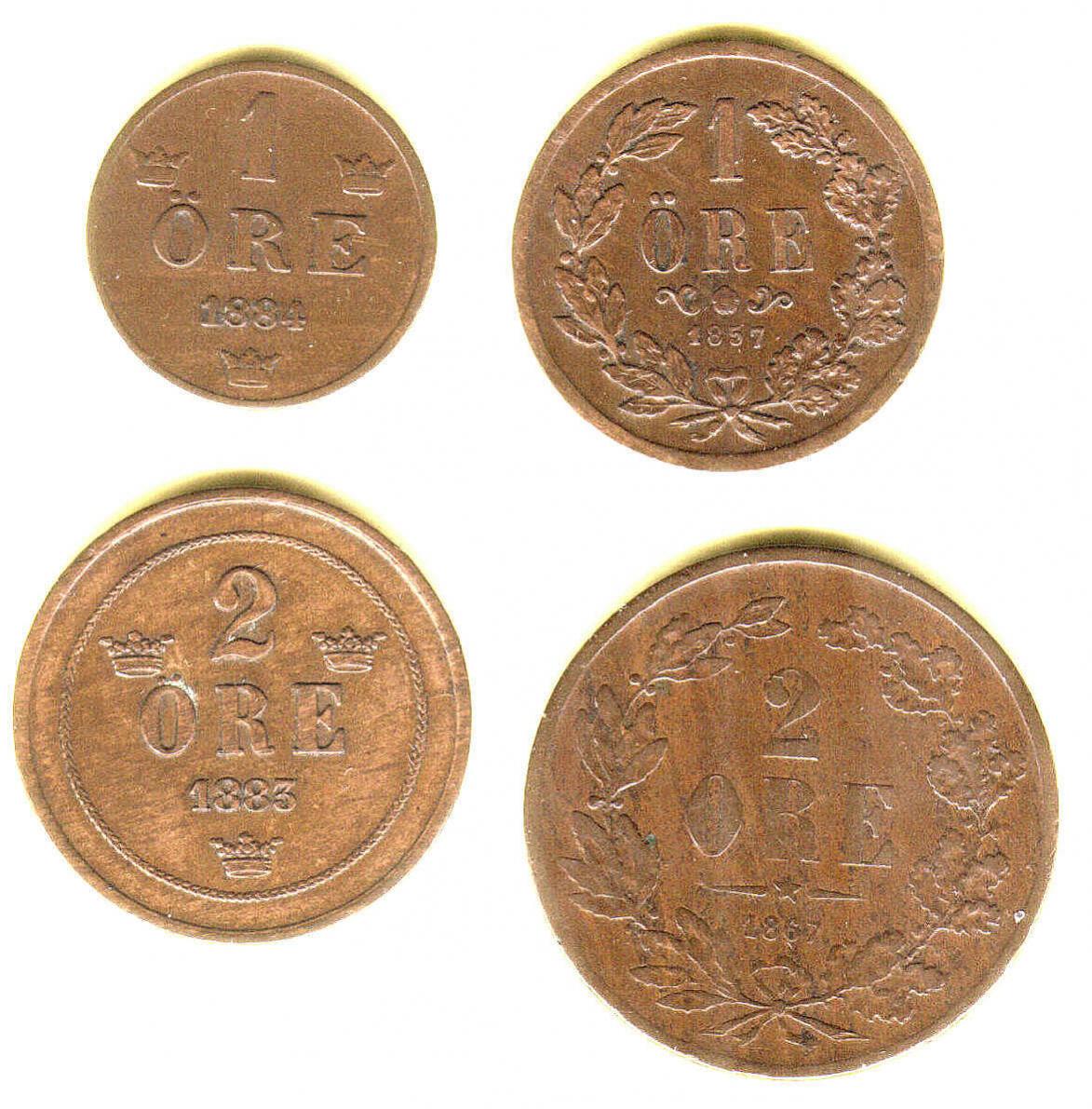 Four Sweden 1 ore and 2 ore, 1857 to 1884, Group #1