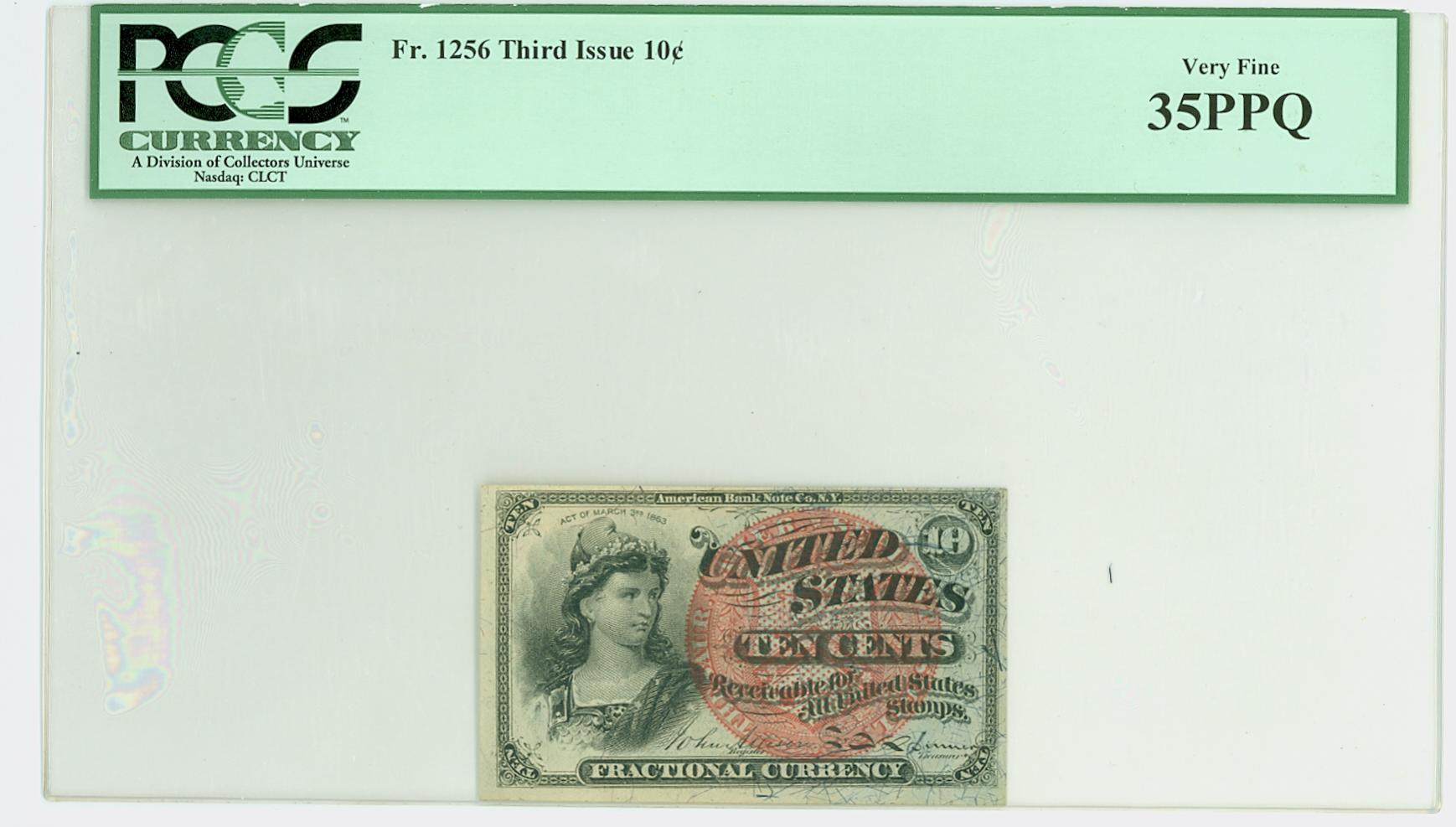 Hey guys, I just picked up a 10 cent piece for fractional currency to give away for my March Madness contest, and I had a couple questions about it. 1) It looks like it is labeled wrong to me. This looks like a 4th issue not a 3rd issue. If you guys agree, is there anything that Pcgs would do about reholdering it with the correct information? 2) This is my first piece of graded currency, and the first thing that I noticed was what appeared to be some type of oil in the holder, creating various rainbow patterns in the holder. Is this normal or does it pose a threat to the note? Thanks for any help with these questions, comments on the note, and be sure to check out the contest section for a change to win it!