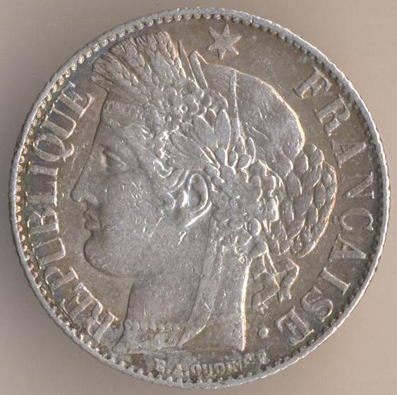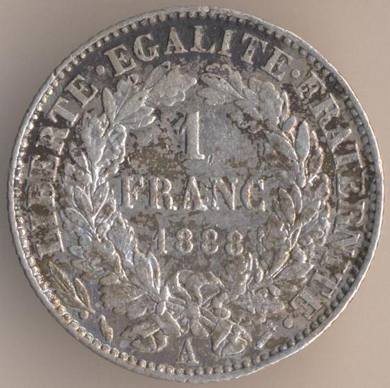 1 franc 1888, silver .835, weight - 5 g., size - 23 mm, thickness - 1 mm, mintage - 3244000 pcs. Engraver: Eugene-Andre Oudine. Coins of this type were released at 1871-72, 1878, 1881, 1887-89 and 1894-95.