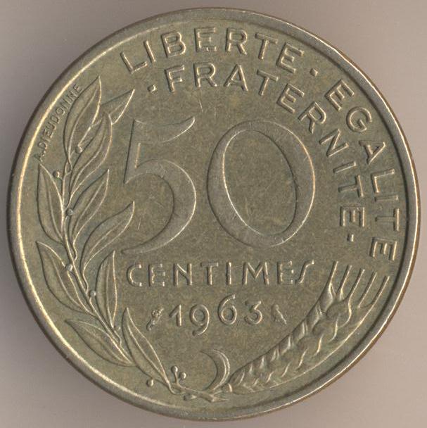 50 centimes 1963, aluminium-bronze, weight - 7 g., size - 25 mm, thickness - 2,15 mm, mintage - 62482000 pcs. Engravers: Henri Lagriffoul (obverse) & Adrien Dieudonne (reverse - face value). Coins of this type were released at 1962-64. Demonetized on January 11 1965.