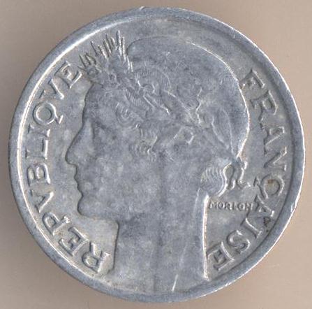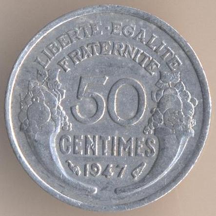 50 centimes 1947, aluminium, weight - 0,7 g., size - 18 mm, thickness - 1,19 mm, mintage - 51744000 pcs. Engraver: Pierre-Alexandre Morlon. Coins of this type were released at 1941, 1944-47. Demonetized on July 31 1950.