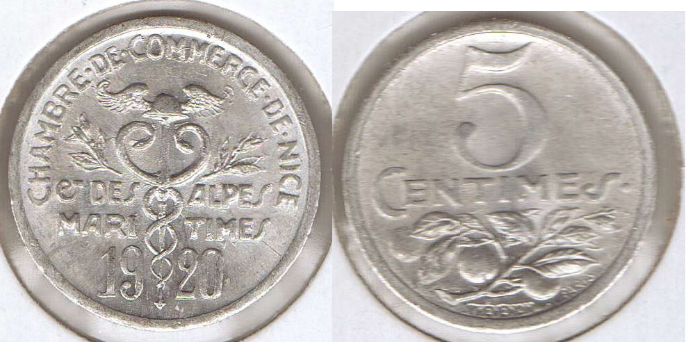 Has anyone ever seen one of these before? It's about the size of an American penny and is aluminum. It says "Chambre de Commerce de Nice. Des Alpes Maritimes 1920" on one side and "5 Centimes" on the other. I know Nice is a city in France, and this is kind of similar to the style of French coinage at that time, but I've never seen anything like it before. Is it a token or some sort of post-war emergency coinage like in Germany, or something else?