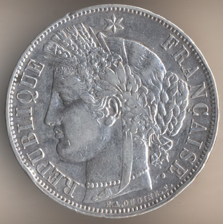 5 francs 1850, silver .900, weight - 25 g., size - 37 mm, mintage - 14619352 pcs. Engraver: Eugene-Andre Oudine. Paris Mint.