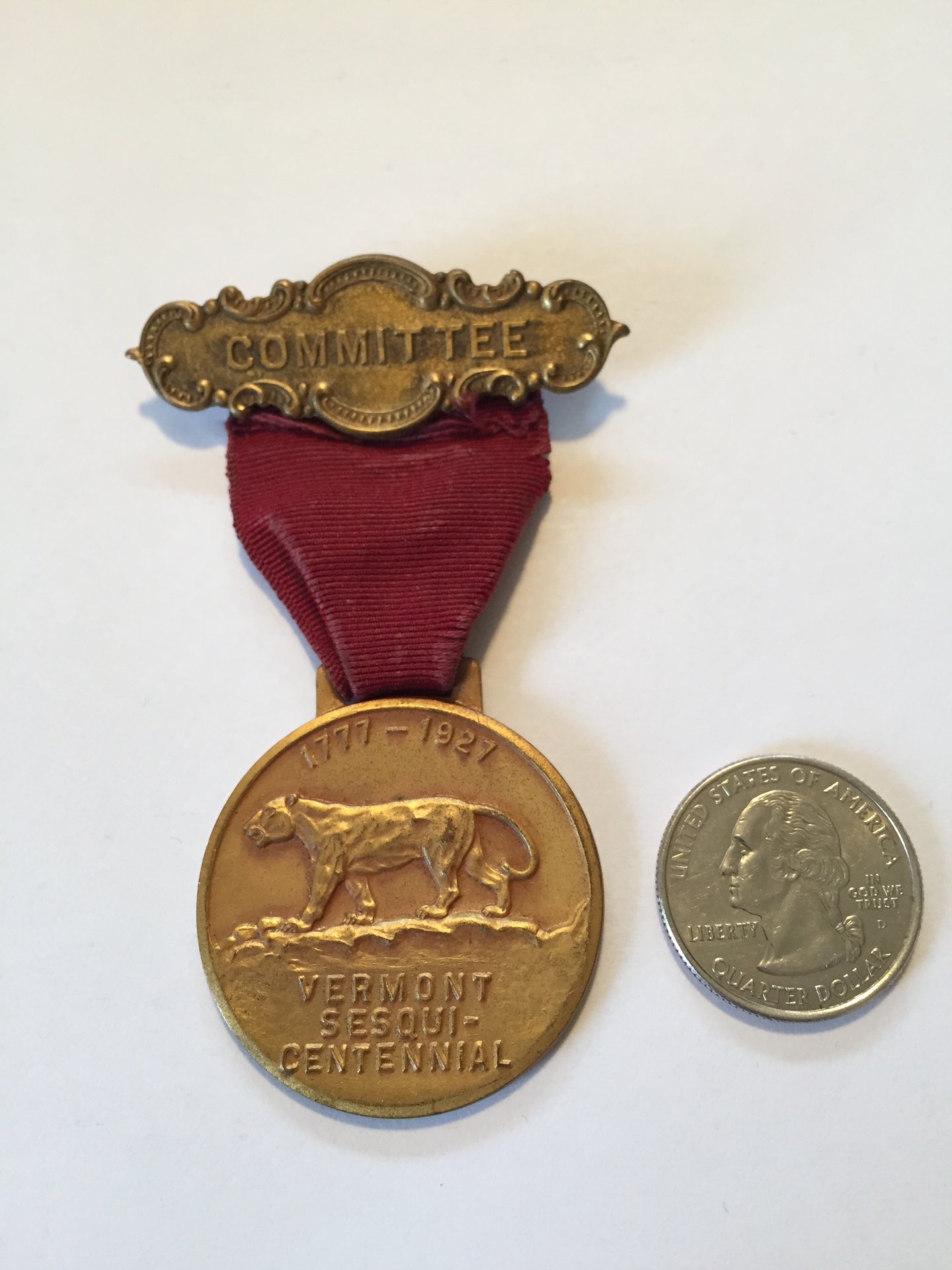 Vermont established its Sesquicentennial Committee in 1925. Among other duties it was tasked with coordinating the design of the 1927 commemorative silver half dollar. The final sculpture for the half was produced by sculptor Charles Keck (whom also designed the 1915 Panama Pacific $1 gold coin). I believe Keck also sculpted this medal due to the similar appearance of the catamount shared on the 1927 commemorative half dollar reverse. This medal was struck by the famous Whitehead Hoag manufacturer in New Jersey. Due to the fact there were very few members on the committee, there are few of these known to be in existence. Known documented specimens (not including this one): The Bennington Museum of Art,History, and Innovation: Two examples containing a committee shield with blue ribbon and an example with a chairman shield and blue ribbon. An un-pictured committee specimen was sold at a 2013 auction with Swann Galleries for an unlisted sale price. A specimen with committee shield and maroon ribbon posted on the NGC coin forum in 2015. Please see the pictures for condition of the medal/ribbon. Cost is $130 with free shipping to CONUS. Prefer Paypal FF or USPS MO.
