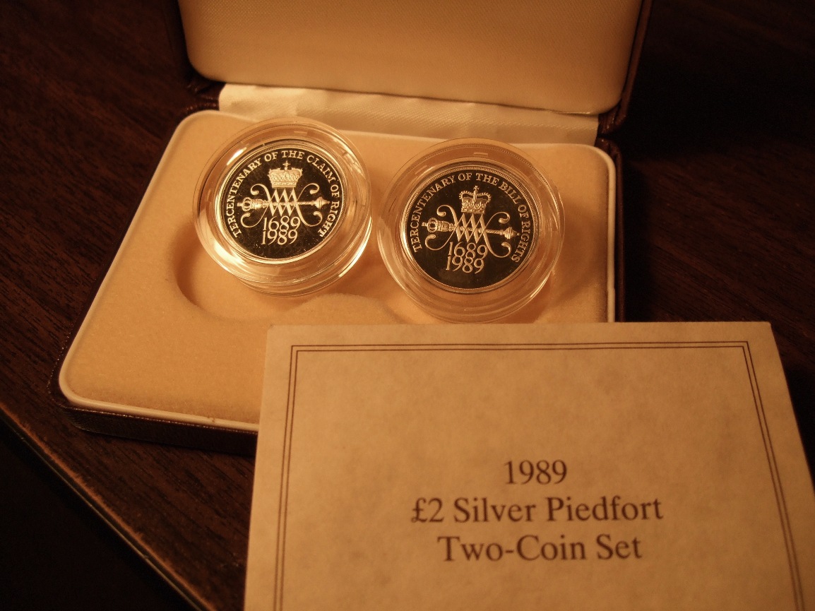 Pristine proof set of 2 in original case, Krause Great Britain Pieforts #P10 and #P11, silver £2 Claim of Rights (mintage 10,000) and silver £2 Bill of Rights, (mintage 25,000) as per photo. Mintages from 2011 Krause-Cuhaj Catalog. Price, $100 postpaid and insured. Shipped to U.S. only. For this item, payment by Postal Money Order only. Reference, American Philatelic Society Life Member #12078.