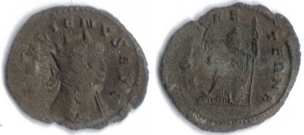 Gallienus BI Antoninianus, 3.0g, 24mm OBV: GALLIENVS AVG, Radiate head right. REV: ROMAE AETERNA, Roma helmeted, seated left on shield, holding victory on globe and spear right. REF: I need some help getting a catalog ID for it. It's a minor reverse legend variation on this common seated Roma reverse. At first I thought it was Pax because there is PAX AETERNA legend. Rudi cleared that up for me. Pax is never seated. There is no ROMAE AETERNA legend in RIC as far as I know. The common legend is ROMAE AETERNAE. Does anyone know if this variety is in RIC or another reference book? I would like some help, thanks.