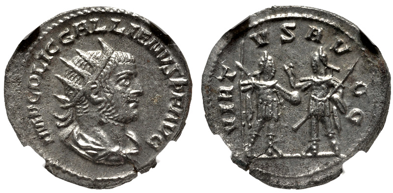 Roman Collector, I'd like to throw another Gallienus antoninianus into the mix. I bought this coin at a CNG auction 426, lot 550 (already slabbed), & attributed to the Samosata Mint, 2nd emission, AD 256-260. The reverse inscription reads "VIRTVS AVGG". Gallienus & Valerian are facing each other.