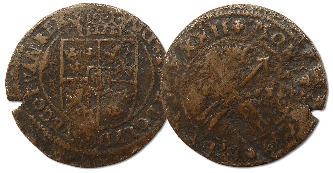 I'm going to go with a double tournois - Louis XVII. I can't see a any marks so I will risk only KM 72.X or 86.X.