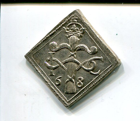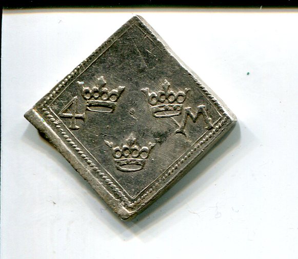1568 Another 4 Mark Klippe from Sweden but this one issued jointly by Dukes Johan and Karl in the short interregnum after the deposition of their half-brother, King Erik XIV, on grounds of insanity, in September 1568. (He would die in captivity in 1577, probably poisoned with arsenic mixed in his pea soup). All three were the sons of Gustav Vasa. Johan had the title of Duke of Finland and Karl Duke of Sudermannia. In January 1569, Johan was recognized as king by the same riksdag that had forced Erik off the throne. Karl would succeed him as King Karl XII in 1592.