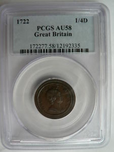 It must be a typo. Size is everything. :devil: That said, it's easy to make a mistake when coins are similar looking, but different in size and weight. Note these two coins: The 1724 "farthing" is bigger than than the 1722 farthing. Either the 1724 "farthing" is on a much larger flan (unlikely), it's a counterfeit, or it's a mistake (most likely). I've concluded the 1724 "farthing" is a halfpenny and the mistake was made by even an expert. Unfortunately for the seller, the halfpenny is worth more. guy