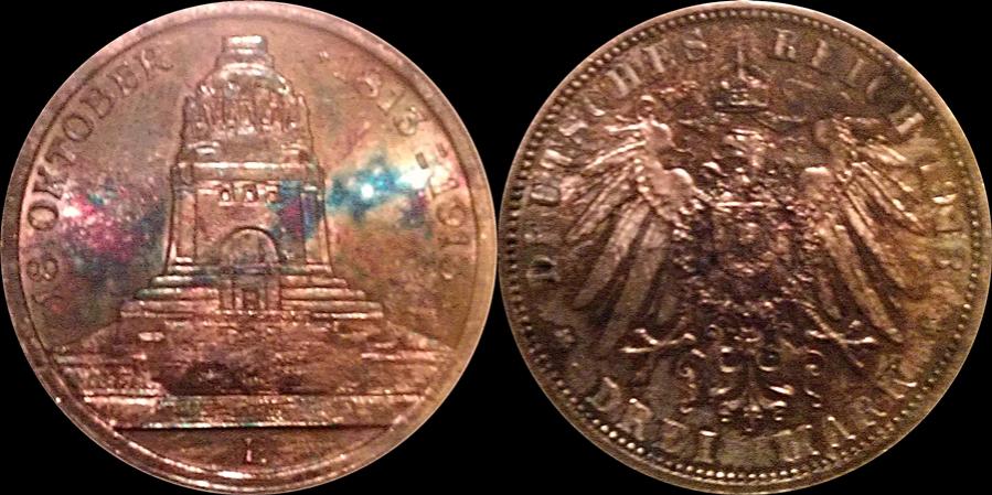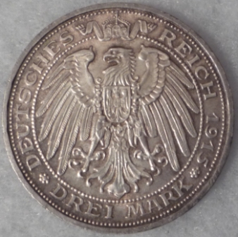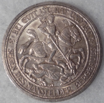 Another empire coin of 1915. To mark the centennial of Mansfeld belonging to Prussia this commemorative 3 - mark was struck. Origionally there where plans to strike 700.000 specimens, but due to the war situaution only 30.000 where allowed. The silver for this issue actually came from the mines at Mansfeld, where prospectoring had a long history back to the time b. C. The coin shows St. George and the dragon, wich was a traditional motive on Mansfeld coins, on the obverse you can see a modernized eagle. This modell was used on some commemorative issues only, but one can only guess if this is what Empire coins at a given point might have looked like in case there would not have been anny WW I.