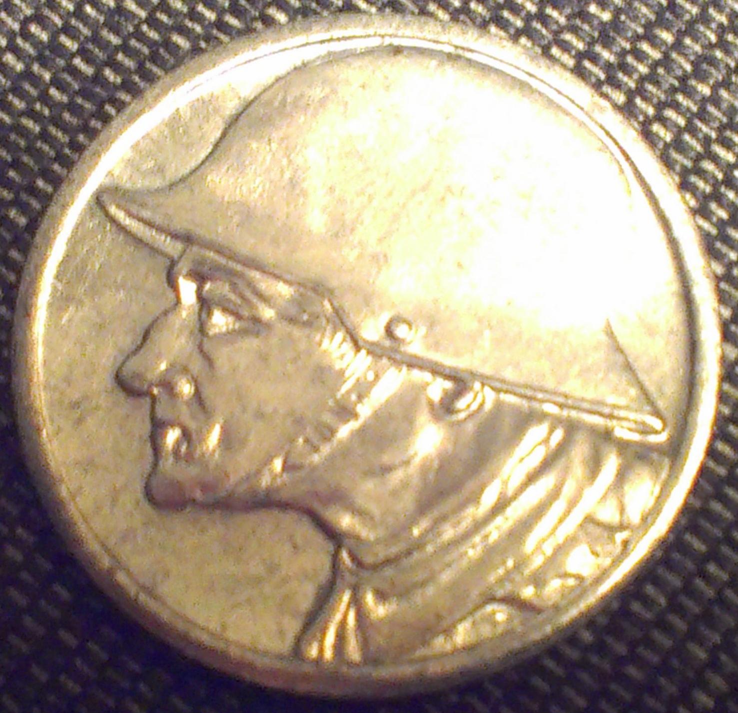 Guess those are two images of two different coins. The one with the soldier is notgeld from Düren (10 Pf 1918 methinks), the other one is a Deutsches Reich coin from the post-WW2 allied occupation years. Christian